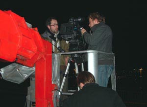 Regisseur Carstens und Kameramann Nieschalk auf der Hebebühne