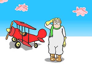 Ein stolzer Flieger ... Fliegen? Klatsche? Richtig: Fliegenklatsche! Was da eingangs als lustiges Männlein mit dickem Bauch, der keck fliegerheldisch gereckt dann doch dumpf in die Weichen zurückfällt, ins Bild marschiert, um solchen Schwer- und Beschwerniskräften zu trotzen und als Roter Baron noch keckere Flugakrobatik im Doppeldecker zu betreiben, endet unter der Klatsche einer Fliege als rosa Wolke.