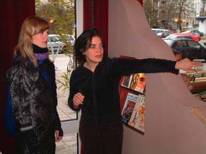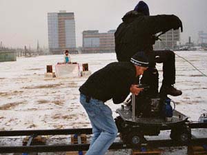 Auf dem Bildschirm sieht man die drei Heldinnen, vielleicht nach einer durchfeierten Nacht, durch eine moderne, betongefasste Eisenbahnunterführung in Richtung Licht gehen. Den Tipp für die Unterführung hab ich von Lorenz Müller, Mitarbeiter der Filmwerkstatt, das müssen wir unbedingt festhalten, erinnert sich Rückert selbst. Sollen wir noch eine? fragt sie in Richtung Pinne, der prompt die nächste DV-Cassette einschiebt: Eine junge Frau schließt ein noch leeres Café auf und beginnt mit den Vorbereitungen für das Tagesgeschäft. Plötzlich bevölkern Hühner den Bildschirm, flattern vom Tresen auf den Fußboden. Das sind Einstellungen für einen Tagtraum, erklärt Rückert. Warte mal, wieso kommen die Einstellungen jetzt schon? Pinne, der auch den Ton beim Filmen genommen hat, beruhigt: Die Hühner haben wir zuerst gedreht, die mussten dann wieder weg.