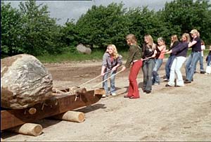 Aber man darf nicht nur Hände sehen, man muss auch den Menschen dahinter zeigen, beschreibt Denzer sein Drehbuchkonzept. Mit Schülern wurde der Megalith-Transport live im Freien nachgestellt, was der Film in seinem zweiten Teil zeigt und so die historische Technik mit- und nacherlebbar in Szene setzt.