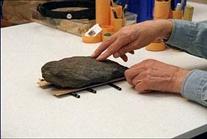 Keine computeranimierte Trickbox, sondern ein richtiger Film musste her. Vorgaben: Der Film musste ohne Ton und ohne Texteinblendungen auskommen, denn er sollte im Museum in einer Vitrine (in Endlosschleife von DVD) gezeigt werden. Und er durfte nicht länger als drei Minuten sein, denn das ist der Erfahrungswert für die Verweildauer eines Museumsbesuchers vor einer Vitrine. Denzer arbeitete bei der Produktion eng mit dem experimentellen Archäologen Harm Paulsen zusammen. Paulsen ist bekannt für seine genau recherchierten Nachstellungen historischer Alltagstätigkeiten. In Der Schlitten der Steinzeit - Transport eines Megalithen erfindet Paulsen am Schreibtisch nach, wie man einen schweren Körper mit Rollen transportieren kann, dass es nicht genügt, den Megalithen selbst auf Rollen zu legen, sondern dass man dafür Bohlen braucht, auf denen der Stein ruht. Mit präzisem Blick zeigt die Kamera Paulsens Hände beim Hantieren mit einem Lineal (Bohle) und Bleistiften als Rollen.