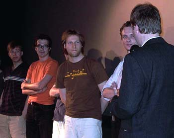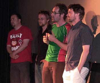 Die Jury (v.l.: Cerstin Gerecht, Karsten Wiesel, Bernd Fiedler) und Bernd-Günther Nahm, Geschäftsführer der Kulturellen Filmförderung S.-H. bei der Preisvergabe Neben Mertens Die andere Seite, einem facettenreich mit Perspektivwechseln, Vor- und Rückblenden spielenden Kurzfilm über eine Bankräuberin, die vielleicht nur der entschlossenen Fantasie des erzählenden Protagonisten entsprungen ist, unterstrichen bei der Augenweide gleich mehrere Premieren, dass sich schleswig-holsteinische Filmemacher nicht scheuen, ungewöhnliche Blickrichtungen zu etablieren und damit die Weiterentwicklung der traditionellen Erzählweise des Spielfilms (Jury-Begründung zu Die andere Seite) voranzutreiben.