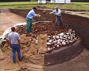 FilmTrain 2004-2006Archäologen über die Schulter geschaut„So süüt dat ut, Ausgrabungen in Hüsby” (Hilke Elisabeth Saggau, D 2005)Auf den ersten Blick unterscheidet sich eine archäologische Ausgrabung nicht unbedingt von einer gewöhnlichen Tiefbaustelle. Schaufeln und Schubkarren, Bagger und Vermessungsgeräte sind immer vor Ort, wenn große Mengen Erdreich zu bewegen sind. Die körperliche Arbeit bleibt, denn Granitbrocken werden nicht leichter, nur weil sie von einem bronzezeitlichen Grab stammen. Und wenn es regnet, wartet man im Bauwagen mit Butterbrot und Thermosflasche auf besseres Wetter. Eine Mischung aus bodenständiger Handwerkstradition und akademischem Forschergeist prägt die spezielle Atmosphäre auf einer Ausgrabung, wo sich Fortschritte oft nur in zermürbender Langsamkeit vollziehen. Nicht ohne Grund wird die Archäologie auch die „Wissenschaft des Spatens” genannt.