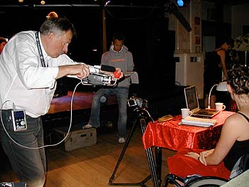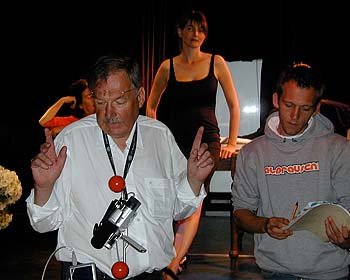 Spaß beim Drehen mit der kleinen Kamera: Bernd Fiedler (Fotos: jm) Kein Riesenstab, lediglich zehn Leute arbeiten unauffällig hinter der Kamera, keine aufwändige Beleuchtung, keine Kamera, für die für jede Fahrt die Schienen des Dolly neu verlegt werden müssten, kein Kabelgewirr fast wie Heimkino bei einer Familienfeier mutet der entspannte Dreh an. Genau so will es das neue Filmproduktionskonzept „Drehbank“, das Bernd Fiedler im Mai beim von der Kulturellen Filmförderung S.-H. veranstalteten Symposium „Kleine Kamera großes Kino“ vorstellte und nach dem er hier erstmals produziert. Kleine, leichte, lichtempfindliche Digital-Videokameras machen möglich, wovon Filmemacher früher nur träumen konnten: Schwenks und Fahrten aus der Hand (unterstützt von Fiedlers Erfindung „Steady Grip“, einem Doppelgriff, der unter die Kamera geschraubt wird), Drehs unter „authentischen“ Lichtverhältnissen. Vor allem aber senken sie die Produktionskosten auf ein Zehntel. Mindestens rund eine Million Euro kostet sonst die Produktion eines abendfüllenden Spielfilms und das ist schon eher „Low Budget“. „Drehbank“ definiert den Begriff neu, nicht nur finanziell und vom Zeitaufwand her (der Film wird schon Ende Oktober fertig geschnitten sein), auch ästhetisch. „Das machen wir nochmal“, bittet Fiedler, „Kamera läuft weiter“. Ein Ding der Unmöglichkeit wäre dies bei teurem 16- oder gar 35mm-Film, doch die Festplatten, auf die die digitalen Filmbilder aufgezeichnet werden, sind geduldig und preiswert. Für den Dreh bringt das „lange Einstellungen, mehr Tempo und Konzentration auf das Schauspielerische“, so Fiedler. Neue Anforderungen allerdings auch für die Schauspieler, denn dass knapp fünf Minuten Dialog in einem Take gefilmt werden, daran müssen sie sich erst gewöhnen, haben dafür aber Zeit, ihre Figuren nicht nur im Stakkato von 10-Sekunden-Einstellungen, sondern kontinuierlich wie auf der Theaterbühne zu entwickeln. Ein weiteres Charakteristikum einer „Drehbank“-Produktion: „eine gute Geschichte“. Ohne die komme man zwar auch sonst beim Film nicht aus, weiß Fiedler, „aber hier kann man Schwächen der Geschichte nicht mit tollen Effekten wie Verfolgungsjagden kaschieren“. Also heißt es „Proben, proben, proben!“ bei laufender Kamera. Im Lutterbeker dreht das Team eine Szene, die nicht von ungefähr auf der Theaterbühne als „Stück im Stück“ spielt. Der pensionierte Studienrat Arno Havemann (Siegfried Jacobs), dessen spätes Glück mit Doro kinderlos blieb, möchte Vater werden. Auch die fast 40 Jahre jüngere Helene (Anna Warntjen), nach einem Unfall an den Rollstuhl gefesselt, strebt nach Mutterschaft. Sie hat keinen Mann dafür, er keine Frau, so bilden beide eine Zweckallianz, die sich jedoch als „kein Kinderspiel“ entpuppt, denn es gibt ja noch die Gefühle ... Am Rande der Proben zu einer „Schmierenkomödie“, die Arno mit ein paar Freunden für das Dorftheater im Gasthof „Zur Linde“ inszeniert, wird ihr Bund durch einen Tanz symbolisch besiegelt. (Film-) Wirklichkeit und Bühne verzwirbeln sich zu einer starken Szene voller untergündig brodelnder Emotionen.