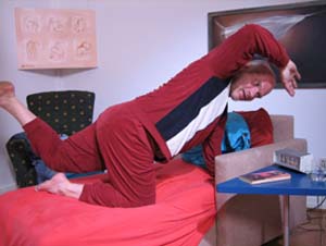 Martin Friederichs bei seiner „Morgengymnastik“ (Foto: Oliver Boczek) Nachdem sie einen Drehort gefunden und ein kleines Filmteam zusammengestellt hatten, konnte mit dem Kieler Schauspieler Martin Friederichs der Traum-Darsteller gewonnen werden. Zuletzt glänzte er in dem Theaterstück „Mein Kampf“ von George Tabori als Schlomo Herzl unter der Regie von Alexander Göpfert am Theater der studentischen Arbeitsgemeinschaften im Studentenwerk Schleswig-Holstein. Als Kamerafrau musste die Bildgestalterin Julia Schwenzer nicht lange überredet werden mitzumachen. Dank ihrer großartigen Lichtsetzung brachte sie die gewünschte Helligkeit in das morgendliche Dunkel. Eine Prämisse galt es einzuhalten: Die Geschichte sollte in einer einzigen Einstellung erzählt werden, das heißt ohne Bildschnitt oder Überblendungen. Nur auf der Ton-Ebene waren Bearbeitungen vorgesehen. Für diese aufwändige Klang-Aufgabe wurde Torben Sachert engagiert. In mühevoller Kleinarbeit bastelte er die (be-) rauschende Untermalung des Filmes zusammen. Ein ganz besonderer Dank gilt auch Carsten Köthe. Als ihm die Idee vorgetragen wurde, war der RSH-Moderator sofort bereit, mitzumachen. In seiner unvergleichlichen Art gab er der Filmproduktion seine Stimme. Die Mühen wurden belohnt: Bei dem diesjährigen Videowettbewerb „Tiefenschärfe 2007“, veranstaltet vom Offenen Kanal Schleswig-Holstein, wurde „Radio Aktivität“ in der Kategorie „Take One“ von der Jury zum Sieger erklärt. „Radio Aktivität“ (D 2007, 3 Min.), Idee, Produktion, Regie: Oliver Boczek und Gerald Grote, Bildgestaltung, Licht: Julia Schwenzer, Tonmischung: Torben Sachert, Darsteller: Martin Friederichs, Sprecher: Carsten Köthe, Musik: Christopher Evans Ironside (nach einer Pressemitteilung von EinfallsReich Film) |