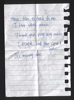 Wir versuchten, uns nicht mit den Programmen anzubiedern, denn wir wussten, dass man in China mit nicht narrativen Filmen nur wenig anfangen kann. Aber gerade weil wir viele Filmstudenten und Filmemacher im Publikum hatten, war es uns ein Anliegen, sie auch mit radikal mit anderen Ausdrucksformen und Arbeitsweisen zu konfrontieren. Das kam auch auf der anderen Seite an. Das mit der asiatischen Zurückhaltung halten wir für ein Gerücht. Die Diskussionen wurden leidenschaftlich und lautstark geführt. In China ist alles mögliche im Umbruch, und dementsprechend sind die Kulturszene und die Medien davon nicht verschont. Und für ein Land, das von einer kommunistischen Einheitspartei regiert wird, ist man dort überaus flexibel. So reichten unsere Kontakte vom Parteisekretär und Uni-Dekan über Professoren bis hin zu Aktivisten der freien Kunstszene. Und alle scheinen einander zu kennen und auch mit ungewöhnlichen Kooperationen kein Problem zu haben. So wurde der Stadtteil, der Chongqings Kunsthochschule beheimatet, offiziell mit Graffiti-Art verziert. Was von Studenten entworfen wurde, übertrugen kommunal bezahlte Wanderarbeiter auf die Fassaden. Und gerade die Institutionen wussten unseren kulturellen Konfrontationskurs zu schätzen und gaben uns nach der ersten Kostprobe gleich die denkbar größten Plattformen. In Chongqing wurden es zwei Nächte Openairfestival mit jeweils über 700 Menschen und in Suzhou 900 Zuschauern in einem Saal. Aus dem Publikum bekamen wir eine Menge rührende Zettel in gebrochenem Englisch zugesteckt und eine Frau versuchte sich auf Deutsch: „Es gibt so grossen Unterschied zwischen deutschen und chinesischen Filmen, und die Probleme, für die wir sich interessieren, sind auch verschieden. Ihre Filme haben unseren Augenblick erweitert und uns eines frisches Gefühl gegeben!“