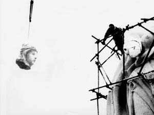 (De-) Montage eines Denkmals: Still aus „und sahen, was zu machen war ...“ Genauso ist „sugar B“ kein „Denkmal“ für einen schwarzen Musiker, der sich allen Marktgesetzen verweigert und so scheitert, sondern die ironische Auseinandersetzung mit dem Genre Künstlerporträt. „Düsseldorf, Notizen am Rande“ hat Sachs vollständig aus „found footage“, vorgefundenem historischen Doku-Material, montiert und dabei die auch ideologisch motivierten Perspektiven des Materials hinterfragt. Diese Technik des „Dazwischen“, eine der Magie der Bilder und Genres kritisch entgegen wirkende und sich doch auf sie einlassende Strategie, entwickelte Sachs in seinen experimentellen Kurzfilmen.