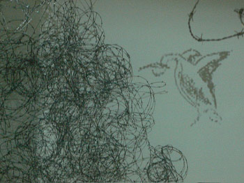 Die Veranstaltung wird organisiert von Friederike Rückert und findet in Zusammenarbeit mit dem Verein Mahnmal Kilian e.V. statt. Nähere Informationen zur Veranstaltung finden sich unter www.weisse-nacht.info. Weitere Informationen erhalten Sie von Friederike Rückert, Mobiltelefon 01577-5396938 oder Privat 0431-5368053, Email: organisation@weisse-nacht.info. Wir danken für ihre Unterstützung: Amerika-Gesellschaft, Filmwerkstatt Kiel der FFHSH, Kulturamt der Landeshauptstadt Kiel, Muthesius-Gesellschaft, Muthesius Kunsthochschule Kiel. Beispiele der künstlerischen Arbeiten: Die französische Künstlerin Delphine GigouxMartin kombiniert Stacheldraht mit einer Videoanimation. Gezeichnete und projizierte Vögel versuchen aus den Gemäuern zu fliehen und verfangen sich dabei im Stacheldraht, den die Künstlerin knapp über Augenhöhe des Betrachters an der Raumdecke anbringt.