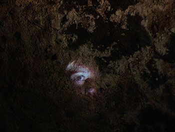 Die Kieler Videokünstlerin Friederike Rückert projiziert Menschen direkt auf die Wände des Bunkers, so dass sie wie eine Video-Höhlenmalerei geisterhaft aus der Mauer zu kommen scheinen.