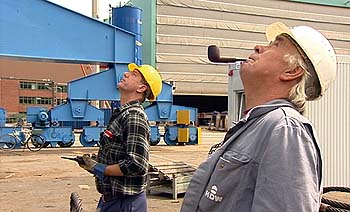 49. Nordische Filmtage LübeckDer Kran, die Kumpels, die Kamera„Katze gut 9 Wochen auf der Kieler Werft HDW“ (Fredo Wulf, D 2007)Drei Männer schauen gespannt hinauf zum „Krupp“, dem Portalkran auf HDW, der „ein inoffizielles Wahrzeichen Kiels ist“. „Katze gut!“, melden sie per Funkgerät, wenn der Kran und seine Traversen in richtiger Position sind.