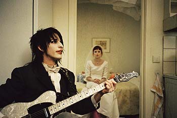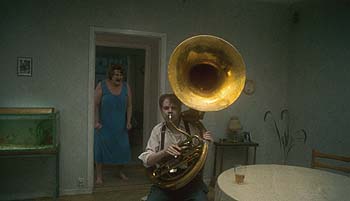 49. Nordische Filmtage LübeckBewegte und bewegende Stillleben„You, the Living / Du levande“ (Roy Andersson, S 2007)Mitteilung an den Webmaster, der diese Besprechung online stellt: Bitte möglichst viele Screenshots in den Text einbauen! Denn Bilder sagen mehr als Worte, zumal bei einem Film, der so über die stilllebendigen Bilder lebt wie „You, the Living“. Nach „Sounds from the second Floor“ (2000) ist dies Roy Anderssons zweiter Genie-, äh ... Regie-Streich, die bewegten Bilder, die ja Markenzeichen des Mediums Film sind, gleichsam ganz und gar auszubremsen. Seine 94 Minuten Episodenfilm bestehen aus 50 Tableaus, die wie wohl arrangierte Gemälde wirken. Die Kamera ist unbeweglich, sie fährt nicht, sie zoomt nicht, sie steht still wie das Auge eines Malers. Die immer in der Totale abgebildeten Räume, in denen die Figuren ihre kleinen, absurden, grotesken Lebensaussschnitte leben oder auch inszenieren, sind Stillleben, die streng nach Zentralperspektiven organisiert sind. Fast immer sieht man in der Ferne eine sich ins Unendliche erstreckende (Stadt-) Landschaft, selbst wenn die nur in einem Fensterausschnitt sichtbar ist. Kameramann Gustav Danielssons statische Einstellungen, deren Lichtführung sie in die unwirkliche oder auch ganz und gar malerisch wirkende Patina von Pastelltönen taucht, sind bis ins feinste Detail nach Gesetzen der Malerei organisiert: Vordergrund, Hintergrund, Nähe, Ferne ein kleiner Kosmos in jedem (szenischen) Tableau.