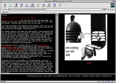 Stimulanz für das neue MediumKulturnetz-Preise 2001 wurden vergebenDie Preisträger des Kulturnetz-Preises hat Kultusministerin Ute Erdsiek-Rave am 17.12.2001 in Kiel bekannt gegeben. Mit dem mit 4000 Mark dotierten Hauptpreis zeichnete die Jury das Hypertext-Projekt "MERz.Monstrum 2.0" des gebürtigen Kielers Jörg Meyer aus. "Bei diesem Netzkunstwerk handelt es sich um ein aufregendes Spiel mit den Möglichkeiten des Internets. Die klassische literarische Form wird hier durch den Betrachter aufgelöst zugunsten eines neuen Textkörpers im Internet", stellte die Ministerin fest. Die Jury vergab weitere Preise an Hauke Harder (3000 Mark), Johannes Michler und Thomas Schulz (je 1000 Mark). Ulrich Eller erhielt den Publikumspreis (1000 Mark).Mit Ausnahme der multimedialen CD-ROM "The Gate [Künstliche Intelligenz?]" von Thomas Schulz, in der die täglichen Fehlleistungen und Störungen digitaler Maschinen thematisiert werden, waren die am "K"-Netzpreis-Wettbewerb beteiligten Arbeiten ausschließlich für das Web konzipiert. Das Spektrum reichte bis zur künstlerischen Reflektion des Mediums Internet in den "Netzarbeiten" von Hauke Harder. Als gelungen wertete die Jury die Umsetzung von "Takt Fläche Raum" des klassischen Bildhauers Johannes Michler in die Virtualität wie auch das Nachspüren des Zusammenspiels von Farbe und Klang im World Wide Web in der Arbeit "Zwölf Farben" des Klangkünstlers Ulrich Eller.Ute Erdsiek-Rave: "Der Kulturnetzpreis stimuliert den Umstieg der klassischen Medien der Kultur auf das elektronische Netz. Innovative Kulturelle Multimedia-Anwendungen, die die Möglichkeiten der elektronischen Abbildung und der künstlerischen Auseinandersetzung mit dem Internet kreativ gestalten, sind hiermit prämiiert worden."Internetuser können unter http://openspace.kulturnetz-sh.de alle Arbeiten einsehen. In der Jury wirkten die Professoren Theresa Georgen, David Bartusch und Bernhard Schwichtenberg, alle Muthesius-Hochschule, mit. Als Vertreter des Ministeriums gehörten Dr. Andreas von Randow und Gert Haack der Jury an sowie der Leiter des Landesmedienzentrums Kurt Geisler.(Jens Oldenburg, kulturnetz-sh.de)zurück zum Inhalt |