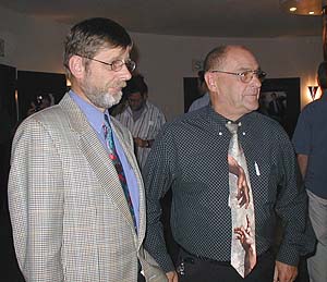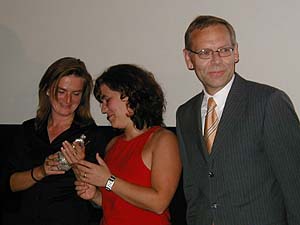 Zwischen Warften und WattwürmernDie Goldene Tine - Rückblick auf den Kurzfilmwettbewerb der Husumer FilmtageSeit hundert Jahren steht sie in Husum auf dem Marktplatz: die „Tine”, ein resolutes Weibsbild mit Paddel und Holzpantinen, benannt nach der Husumer Wohltäterin Anna Catharina Asmussen (1793-1868). Zur Vierhundertjahrfeier der Stadt gönnt man der patinagrünen Fischerfrau nun drei kleine Schwestern in Gold, Silber und Bronze, verliehen auf den 18. Husumer Filmtagen für die besten Kurzfilme zum Thema „Stadt Husum” oder „Westküste“. Hans-Peter Schweger (Volkshochschule), Hans Lorenz Hartung (Kino-Center) und Joachim Steffen (Schleswig-holsteinische Cinématèque), die das Kuratorium der Filmtage bilden, wollten mit dem Kurzfilmwettbewerb ein cineastisches Schmankerl zum Stadtjubiläum liefern. Alle Genres und Formate waren erlaubt, 20 Minuten Länge waren das Limit, der thematische Bezug zur Stadt oder Region waren Bedingung. Hans-Peter Schweger (links) und Hans Lorenz Hartung vom Kuratorium der Husumer Filmtage Aus rund 60 Einsendungen erfüllten elf Beiträge die Kriterien und hatten sich am Samstagabend (13. September 2003) dem kritischen Publikum und einer vierköpfigen Jury (Martina Fluck, Regisseurin und Produzentin aus Heide, Friedrich Laubengeiger, freier Künstler aus Husum, Peter Empen, ehemaliger Bürgervorsteher aus Husum und Lorenz Müller, Kulturelle Filmförderung Schleswig-Holstein aus Kiel) zu stellen. Doch Ruhm, Ehre und die liebevoll gestalteten Trophäen waren nicht die einzigen Anreize zur Teilnahme. Die drei kleinen „Tines” waren mit einer ordentlichen Mitgift ausgestattet. 1.000, 750 und 500 Euro spendete die Sparkassen-Kulturstiftung Nordfriesland als Preisgelder und kreierte damit nebenbei einen der höchstdotierten Kurzfilmpreise im Land, wenn nicht gar bundesweit. Für den Publikumspreis gab es einen weiteren Scheck über 500 Euro, gestiftet von der Stadtwerke Husum GmbH. Südlich des Mains würde man zur Verleihung solcher Summen bereits Staatssekretäre oder Kultusminister herbei zitieren, aber nördlich der Eider geht man gelassen zur Sache. „Silber“ ging an die junge Sylterin Katharina Korell, die sich in ihrer 20-minütigen Doku „Von der Boutique zur Biike” mit Kultur und Kommerz des traditionellen Biike-Brennens auf den friesischen Inseln beschäftigt. Interessante Zeitzeugen erzählen mit Sachverstand und das Thema wird ambivalent betrachtet. Von weitgereisten Touristen, die das Feuer als eigene Urlaubstradition übernehmen bis zum Einheimischen, der dabei seine Grün-Abfälle kostenlos entsorgt. Katharina Korell (Mitte), „Von der Boutique zur Biike”, mit der „silbernen Tine”, rechts: Klaus Jürgen Andresen von der Sparkassen Kulturstiftung Nordfriesland Der mit 1.000 Euro dotierte Hauptpreis der „Goldenen Tine” ging an den 12-minütigen Kurzfilm „kopfüber” von Jörg Streese aus Bremen. Rauhe Schwarzweiß-Bilder eines Segeltörns mit einem 130 Jahre alten Tradtionsschiff wurden mit wenigen Mitteln in eine einfache aber atmosphärisch dichte Geschichte verwandelt. Ein verträumter Sonderling gelangt als blinder Passagier und Schiffsjunge bis nach Amerika und sucht sein Glück in der neuen Welt. Erzählt wird die Story mit Zwischentiteln und Klavierbegleitung im Stil eines Stummfilms. Manchmal ist Schweigen eben doch Gold. (Text und Fotos: Lorenz Müller) |