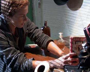 8. Filmfest Schleswig-Holstein AugenweideKongeniales Porträt eines FilmsAufgeblättert - The Making of Tödliche Roman(z)e (Daniel Krönke, D 2004)Tödliche Roman(ze) von Gerald Grote (Produktion, Regie), Karsten Weyershausen (Buch) und Claus Oppermann (Kamera) ist kein ganz normaler Film. Keine Schauspieler, nur Bücher als Akteure, stehende Objekte, die man mit der bloßen Kamerabwegung in filmische Bewegung bringen muss. Entsprechend solcher Besonderheiten ist auch Daniel Krönkes Dokumentation Aufgeblättert kein ganz normales Making of. Zwar zeigt auch Krönke in seinem Film, der mit 13 Minuten nur knapp länger ist als jener, dessen Entstehung er mit der Kamera begleitet hat, typische Making of-Sequenzen, Shots von Kameraleuten an der Kamera, Diskussionen zwischen Team und Regisseur am Set. Aber Krönkes Blick auf die Szenerie, die sich im September 2003 in einer alten Kieler Industriehalle bot, nimmt in Bildgestaltung und Montage Gestaltungselemente der Tödlichen Roman(z)e auf. Ausstatterin Maren Jaenisch bei der Arbeit Krönke interviewt Jaenisch zunächst vor der Szenerie eines stillen Sees, ein kompletter Kontrast zu den komplexen Bildern vom Set, und deutet damit bildnerisch den Prozess, eine Bücherwelt - Geistwelt jenseits von Natur - gänzlich aus dem Nichts zu schaffen. Ähnlich intuitiv und gleichzeitig geradezu symbolisch fotografiert Krönke die Kamerafahrt durch den Dachboden auf das Bücherregal, eine der eindrucksvollsten Szenen in Tödliche Roman(z)e. In raschen Schnitten aus verschiedenen Blickwinkeln auf diese Kamerafahrt, jeweils gegengeschnitten mit dem, was die Kamera dabei sieht, also den späteren Filmsequenzen, gelingt Krönke ein dynamisches Bild des Entstehungsprozesses, das filmdramaturgisch der gezeigten Fahrt in nichts nachsteht. Kamerafahrt mit Kameramann Claus Oppermann (rechts) Derart chirurgisch schaut Krönkes Kamera während der gesamten Dokumentation auf den Prozess, der zu Tödliche Roman(z)e führte. Die Spannung am Set, die minutiös werkende Stille nach dem Fall der Klappe teilt sich dem Betrachter dieses ungewöhnlichen Making of unmittelbar mit und gerät so zu einem Blick hinter die Kulissen, der die Kulisse als immanente Welt des porträtierten Films erscheinen lässt. Die Traumfabrik wird so nicht durch die Schärfe des Dokumentarischen entzaubert, sondern entfaltet ihren Zauber kongenial im dokumentarischen Porträt. Ein Making of, das den Film perfekt ergänzt und beim Filmfest Augenweide entsprechend starke Publikumsresonanz fand. (jm) |