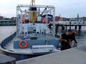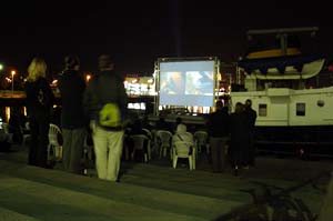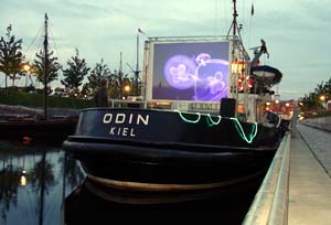 Schlepperkino auf der Kieler FördeDer Sommer schloss gerade seine Pforten und die Abende wurden kühler, als Filmemacherin Friederike Rückert, Wieland Pechmann, Tim Findeisen, Jan Nieswand, alle vier von der Muthesius Kunst-Hochschule in Kiel, zusammen mit Sebastian Assenheimer (Fachhochschule Kiel) bei Wind und Wetter ein Open-Air-Kino der besonderen Art an und auf der Kieler Förde veranstalteten. Schlepperkino hieß die maritime Freiluft-Attraktion, die an drei Abenden Kurzfilme und Dokumentationen auf dem alten Schlepper Odin zeigte. Der Schlepper gehört dem Gründer des Achterbahn-Verlags (ehemals u.a. bekannt durch die Werner-Comics, die dort erschienen) Jan Nieswand. Freizeitkapitän Nieswand stellte sein Schiff großzügig zur Verfügung und stand jeden Abend am Steuerrad. So konnten am Septemberwochenende vom 17. bis 19., jeweils nach Einbruch der Dunkelheit, also nach ca. 20.30 Uhr, Kurz- und Dokumentarfilme aus Hamburg, Kiel, Odense, Kopenhagen und Göteborg präsentiert werden, die thematisch im engeren oder weiteren Sinn etwas mit dem Meer zu tun hatten. Die Odin legt ab ... Der Beamer für die Projektion kam vom Kieler Offenen Kanal (Kiel TV), die Stühle borgte das private Kieler Theater Die Komödianten aus, das städtische Kulturamt kam für den Sprit des Schiffes auf. Weitere Sponsoren zeigten sich großzügig. Das Wetter spielte im Großen und Ganzen mit, wenn auch mit kleinen Abstrichen: Samstags nieselte es anfangs noch und am Sonntag war es doch relativ kühl. Die unterschiedliche Open-Air-Kino-Situationen an den jeweils immer anderen Anlegeorten, die die Odin ansteuerte (freitags: Museumshafen, samstags: Anleger Bellevue, sonntags: Hörncampus), forderten die Macher zu unterschiedlichen Vorführlösungen heraus. Mal war die Leinwand achtern auf der Stirnseite des Dampfers gespannt, mal längs auf der Steuerbordseite; mal saßen die Besucher an Bord, mal schauten sie sich von Land aus die Filme an. Da auch die Zuschauer mitspielten und in Scharen kamen, waren die Veranstalter zufrieden. Ihr Idealismus hatte sich gelohnt. ... und wird am Germaniahafen (oben) und am Hörncampus (unten) zur Kinoplattform Sie zeigten Filme von unabhängigen Produzenten, die es sonst schwer ins Kino schaffen. Extra angereiste Hamburger Filmstudenten staunten: So etwas wäre in Hamburg gar nicht möglich. Und Friederike Rückert sprach anschließend von einem gelungenen Probelauf für ihr Strandkino, das diese Kinomacher der besonderen Art für den nächsten Sommer am Falckensteiner Strand planen. Besonders Freitag und Samstag war unser Schlepperkino auch atmosphärisch sehr gelungen, schwärmte Frau Rückert, uns allen inklusive Schlepperkapitän Nieswand hat dieses Spiel für Erwachsene sehr viel Spaß gemacht. Ablegen, Anlegen, Filme zeigen: Dem Schiff wurde ein ganz neuer Sinn gegeben. (Helmut Schulzeck) |