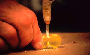 So wird sowohl der Werkgegenstand, die filigrane Bernsteinperle, wie auch seine Bearbeitung, hier mit einem Bohrer, deutlich. Und das im richtigen Kinoformat, denn Denzer drehte neben wenigen Szenen auf miniDV vor allem im 35 mm-Format (16 mm beim Megalithen-Film).