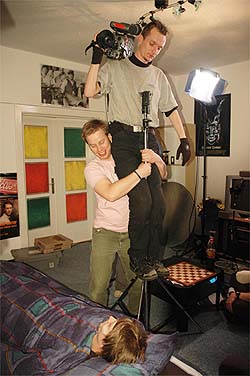 Film/Video-AG im Studentenwerk S.-H. präsentiert: Kieler FilmfrühlingAm 25. April präsentiert die Film/Video-AG im Studentenwerk Schleswig-Holstein auf ihrem traditionellen Filmabend im Sechseckbau wieder die neuesten Regieübungen und Kurzspielfilme ihrer studentischen Mitglieder und Ehemaligen. Anfänger und Fortgeschrittene erzählen auf (filmisch) unterschiedliche Weise kurze Geschichten über Beziehungen, unheimliche Begegnungen, tote Menschen und tote Tiere. Beginn ist um 20 Uhr. Headliner des Abends ist der 30-minütige Debütfilm „Bedhead“ von Christoph Dobbitsch, der am 2. April 2006 im bis auf den letzten Platz gefüllten Traum GmbH-Kino seine Premiere feierte. Wenn die besten Jahre vorbei sind, kann man eigentlich genauso gut im Bett bleiben für immer. Genau das denkt sich auch ein junger Mann (gespielt von Florian Sellke), der einfach keinen Grund mehr findet aufzustehen. Florian Sellke bleibt liegen ... Doch einfach nur im Bett liegen ist gar nicht so einfach wie es sich anhört, wenn überbesorgte Eltern, ein unhöfliche Mitbewohner, die schwangere Freundin, der drogensüchtige Hausarzt und andere skurrile Gestalten ständig die wohlverdiente Ruhe stören. Dreharbeiten zu „Bedhead“ Ein kleiner Einblick in den alltäglichen Wahnsinn, der hier zwischen Bettlaken und Bushaltestelle lauert. Der Film wurde gefördert von der LAG Jugend und Film Schleswig-Holstein. Weitere Filme u.a.: „Frau Kubinsky“ von Maria Reinhardt: Ein einsames Haus, eine alte Frau, eine Gruppe junger Menschen mit einer toten Katze beginnt das Böse seinen Lauf zu nehmen. Der Film wurde gefördert von der LAG Jugend und Film Schleswig-Holstein. In Martin Raabes „Kreuzung“ werden Filmhandlungen immer wieder durch Werbespots unterbrochen, wobei nach und nach beide Ebenen ineinander verschmelzen. (Super 8 und DV, Länge: 7 Minuten, gefördert von der LAG Jugend und Film Schleswig-Holstein.) „Entenfang auf friesisch“ ist eine 4-minütige Reportage über die alte nordische Fangtechnik der Vogelkoje. Autoren: Sven Bohde und Tino Bräuer, Produktion: Arbeitsgruppe Geographie und Medien der Christian-Albrechts-Universität zu Kiel. In Torben Sacherts „Unser Film“ erlebt ein Paar seinen Lieblingsfilm im Kino. Gedreht in einer Einstellung. Eine Hommage an das Kino. „Schlag auf Schlag“ Gerald Grotes und Claus Oppermanns fiktive Reportage über einen Mann (Gerrit Seyler) mit (unter-) nehmerischen Qualitäten. |