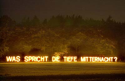 Schrift im Land ein Projekt an unvorhergesehenen OrtenUnterstützt von der Oberbürgermeisterin der Stadt Kiel, dem Kirchenkreis Kiel, mit Hilfe von Kolleginnen und Kollegen sowie durch die finanzielle Unterstützung einiger Sponsoren konnten wir im Herbst 2004 im Rahmen der Veranstaltungsreihe „Nietzsche in Kiel“ erstmalig eine Kunstaktion im Rahmen von „Schrift im Land“ durchführen. Eine ca. 50 Meter lange und zwei Meter hohe Leuchtschrift erschien Nacht für Nacht an einem Waldrand neben der BAB 215 bei Kiel. „Was spricht die tiefe Mitternacht?“, ein Zitat von Friedrich Nietzsche, stellte die Frage nach den Dingen von Bedeutung, die uns nach Ende des Tagesgeschäftes in unseren Gedanken und Träumen bewegen. In den vier Wochen der Installation wurde die Leuchtschrift zunehmend Thema der Diskussion, bis hin zu Kommentaren im Radio. „Schrift im Land“-Projekt 2004 (Foto: Frank Peter) Folgende Aspekte sind Schwerpunkte im Rahmen von „Schrift im Land“: