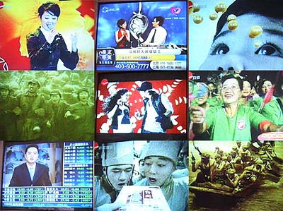 Man interessierte sich eher für Jugendsubkulturen als für Politik. Eine Befragung von Schülern ergab, dass kaum noch jemand Arbeiter werden möchte. Man hofft auf eine Zukunft im IT-Bereich und natürlich bei den Medien. Im Wirtschaftsboom hat sich eine Goldgräberstimmung ausgebreitet, und die Medien könnten durchaus gute Leute gebrauchen. Das Fernsehen ist einfach unglaublich. Ein Volksmusiksender bedient das Publikum rund um die Uhr mit Musikshows, die kein Stück besser sind als die deutschen, dafür aber in gewaltigen Hallen vor einem begeisterten Publikum inszeniert werden. Maos langen Marsch gibt es im Stil einer Seifenoper, ständig unterbrochen von Webespots für Coca Cola, Handys und Make Up. Der Sportsender wird nicht müde, die Olympischen Spiele in den schillerndsten Farben anzukündigen, und ein Wirtschaftssender hält einen über die aktuellen Börsenkurse auf dem Laufenden. Ein Sender ist den Verkaufshows vorbehalten, und man kann Goldkettchen, Fitness- oder Küchengeräte telefonisch bestellen. Das Ganze ist mit derart heißer Nadel gestrickt, dass es schon mal vorkommt, dass die gleiche Kurzreportage dreimal hintereinander über den Bildschirm geht und bei einigen Sendungen und Werbespots vergessen wird, den Timecode auszublenden. Viele Spielfilmproduktionen sind ausgeleuchtet wie Seifenopern, so dass selbst die ins Chinesische synchronisierten Hollywood B-Produktionen ästhetisch wohltuend wirken. Und wirklich beeindruckend ist das Faible für Kriegsfilme. Zu jeder Tageszeit befindet man sich in Grabenkämpfen mit den Japanern, oftmals auf mehreren Kanälen gleichzeitig. Das gilt aber nicht allein für das Fernsehen, auch die Straßenhändler, die raubkopierte DVDs zu umgerechnet einem Euro anbieten, haben neben den aktuellen Hollywood Blockbustern auch ein reichhaltiges Kriegsfilmsortiment besonders die mit einem Hakenkreuz auf den Cover scheinen recht populär.