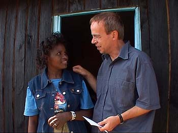 Wiedersehen in Deutschland Wangechi und Helmut (Fotos: hsch) Wangechis Familie weiß noch nichts von der Heirat und Helmut hat nach kenianischem Verständnis einen Tabubruch begangen, denn eigentlich hätte er bei Wangechis Vater um ihre Hand anhalten und ein Brautgeld bezahlen müssen, auch wenn Wangechi bereits einmal verheiratet war, verwitwet ist und bereits vier Kinder hat. Denkbar schwierige Bedingungen also für den Weißen aus dem fernen Europa auf der Farm in Kenia. Nur schwer lebt sich Helmut ein und erfährt dabei den gleichen Kulturschock wie Wangechi, als sie nach Deutschland kam und bei aller Be- und Verwunderung für das ihr fremde Land doch resümiert: „I have thought, I would come to paradise. But it is not ...“ Obwohl Wangechis Familie Helmut nach kurzem Zögern herzlich in den Familienclan aufnimmt, bleiben Zweifel und Unverständnis auf beiden Seiten, auch in der Beziehung des schwarz-weißen Liebespaars. Wie kann man so etwas dokumentieren, darstellen? Eben im Kleinen: Helmut regt sich zunehmend darüber auf, dass man die Wege, die sich nach den regelmäßigen Regenfällen in Schlammwüsten verwandelt haben, nicht benutzen kann. Wangechi wie ihrer Familie ist es hingegen fremd, sich über so etwas überhaupt Gedanken zu machen „We don’t care about the mud“, versucht sie ihrem Ehemann zu erklären. Der jedoch packt an, um auf dem schwiegerelterlichen Hof einen Steinweg zu bauen. Halb ratlos, halb hilfsbereit helfen ihm die Familienmitglieder. Am Ende steht Helmut der Schweiß auf der Stirn und der Weg ist misslungen „derselbe Modder wie vorher, nur jetzt mit Steinen drin“.