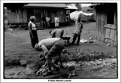 Wenn ich nicht Gast wäre, würde ich sofort anfangen, aber ich könnte hier doch nicht in Seelenruhe leben, ohne über die Verbesserung der Situation nachzudenken. Zeit haben sie alle im Überfluss, es gibt keinen Stress, man sitzt rum und die Handarbeit machen sowieso die anderen, die dann mit 100 KS pro Tag bezahlt werden. Wieso laufen sie vom Wohnhaus mit der guten Stube immer 2 Meter durch den Morast über den Hof in die Küche? Es regnet viel die Tage. Man könnte doch einen Weg aus Steinen bauen, schlage ich vor. Papa Wangechi hat nichts dagegen.