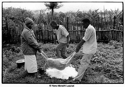 Joseph kommt uns immer wieder besuchen. Früher war er Fremdenführer in einem Safari Hotel. Er lädt uns ein, für Freitag um 12 Uhr. Eine konkrete Uhrzeit hier in Afrika empfinde auch ich nach zwei Wochen schon fast als Drohung. Da kann man nur pünktlich sein. Wir geraten in eine Verlobungsfeier. Seine Tochter wird verheiratet und der Clan des Bräutigams rückt mit 50 Personen, einer Kuh und Ziege an. Wir sind mitten drin, filmen und fotografieren. „Macht Fotos“ sagt Joseph, „deshalb seid ihr hier“, eine sehr tiefe philosophische Betrachtung oder die Bemerkung eines Schlitzohrs. Aber unsere Interessen sind deckungsgleich und Joseph bekommt seine Fotos.