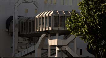 Kai Zimmer beim Dreh (Foto: jm) So zieht Zimmer seit Juni durch die Kieler Hafenlandschaften, ausgestattet mit Foto- und Filmkamera, aber auch einem digitalen Tonaufnahmegerät. „Ganz bewusst intuitive“ Vorstudien für einen Film, bei dem „Kiel eigentlich nur Kulisse ist“. Zimmer will keinen klassischen Kiel-Film drehen, kein Stadtporträt. Gleichwohl werde man Kiel zumindest als Kieler in jedem Ton und jedem Bild wiedererkennen. Beide sind für eine der wenigen Hafenstädte, in der Hafen und Innenstadt quasi ein und derselbe Ort sind, einfach typisch und unverwechselbar. Etwa das surreale Bild, das man einfangen kann, wenn man von der Altstadt gen Förde schaut und „Schiffe wie Häuser, die durch die Straßen fahren“, sieht. Oder die Gangways, die sich „wie Nabelschnüre“ mit dem Ostseekai und damit der Stadt verbinden. Zimmer fotografiert und filmt derlei mit dem Teleobjektiv. Ihm geht es um den Ausschnitt, nicht das Panorama, „das Verhältnis von nah und fern, hell und dunkel, außen und innen“.