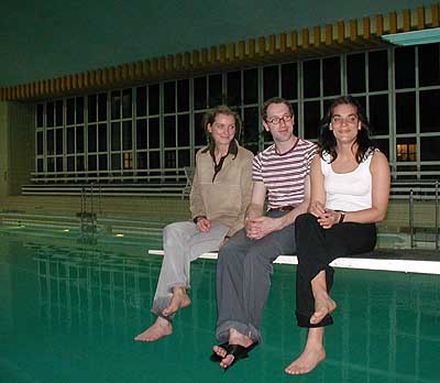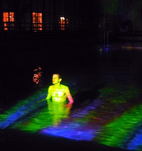 Verflüssigung der BilderLiquid Images zeigten beim Kultur-Rausch in der Kieler Schwimmhalle am Lessingplatz Film-Clips auf, im und unter Wasser.Über und in die Wellen wogen Bilder eines überdimensionierten Auges, das Wärme-Bild einer Frau in der Infrarotkamera, Schmetterlinge, die zu Fröschen und Quallen mutieren, und animierter Zahlentext als Metapher für das digitale Zeitalter der Daten- und Bilderströme, in die man buchstäblich eintauchen kann. Liquid Images heißt das Projekt von Friederike Rückert, Ina Pirk (beide Studentinnen an der Kieler Muthesius-Hochschule) und der Optischen Bank des Video-Diskjockeys Michael Carstens, das am 11. und 12. März in der Schwimmhalle am Lessing-Platz realisiert wurde.![]() ![]() ![]() ![]() (v.l.n.r. - Fotos: jm)Auf den experimentellen Charakter des Augenblicks setzen die drei Künstler bei der Live-Performance in der Lessing-Halle, deren ganz eigenes architektonisches Ambiente aus den 30er Jahren nicht unerheblich zur Schaffung eines Bilder-Raums beiträgt und darin nicht zuletzt zurück zu sich kommt. Die Projektion auf vor die sieben Fenster gehängte Opera-Folien macht den Bilderraum auch im städtischen Umfeld außerhalb der Schwimmhalle erfahrbar. Das Wasser spiegelt die Bilder an die Decke der Halle und eröffnet so eine weitere Projektionsfläche, die vom in den Bildern schwimmenden Publikum und seinen Schattenwürfen interaktiv beeinflusst wird.Lobend erwähnt das Bilder in liquide Stürme aus Pixeln verwandelnde Trio die kongeniale Kooperation mit dem Team der Schwimmhalle. Sollte sich das Konzept bewähren, plant man Fortsetzungen solcher Animationen mit in Bildern badendem Publikum als regelmäßiges Event in der Lessing-Halle. (jm)zurück zum Inhalt |