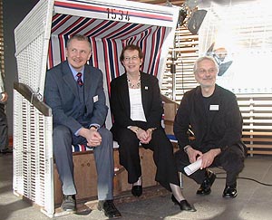 Drei Gastgeber sitzen in einemKorb: v.l.: Roland Schmidt, Heide Simonis, Bernd-Günther Nahm (Foto: jm)Ministerpräsidentin Heide Simonis sagte, dass sich die im vergangenen Jahr auf dem Filmbrunch geknüpften Kontakte bewährt hätten. Als Beispiel nannte sie einen Verbund, den die Filmfestivals im vergangenen Jahr erstmals geschlossen haben. Sie wollen sich künftig gemeinsam präsentieren und voneinander profitieren. Im Rahmen eines Runden Tisches seien außerdem Filmmusiker, Medienstiftung, Festivalveranstalter, das Schleswig-Holstein Musik Festival und Ausbildungseinrichtungen wie die Musikhochschule und die International School for New Media zusammengebracht worden. Erstes Ergebnis dieser Zusammenkunft ist eine zentrale Internetseite. Unter