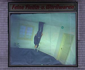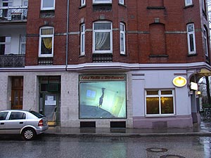Verkehrtheroom - Videoinstallation von Friederike RückertIn den ersten Tagen des Februars wurden Passanten in der Hansastraße/Ecke Gutenbergstraße nach Einbruch der Dunkelheit durch ungewöhnliche Bilder zum Einhalten und genauem Hinschauen bewegt. Hinter einem großen Schaufenster schien der Blick frei zu sein auf ein fast leeres, weiß gestrichenes Zimmer, darin ein Stuhl und eine Pflanze. Zwei Türen und ein Fenster mit Blick auf blauen Wolkenhimmel deuten eine Welt außerhalb an. Der Raum scheint jedoch keinen physikalischen Gesetzmäßigkeiten zu unterliegen. Eine junge Frau hängt unter der Decke, versucht zunächst vergeblich auf den Boden zurückzukehren. Als ihr das nicht gelingt, beginnt sie, den Raum spielend zu erkunden. Sie kann jedoch nie die hermetische Welt des Zimmers verlassen.![]() ![]() ![]() |