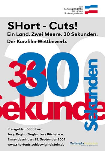 SHort-Cuts! Ein Land. Zwei Meere. 30 Sekunden - Kurzfilmwettbewerb der MinisterpräsidentinDie schleswig-holsteinische Ministerpräsdentin Heide Simonis hat einen ungewöhnlichen Kurzfilm-Wettbewerb ausgeschrieben: SHort-Cuts. Ein Land. Zwei Meere. 30 Sekunden - unter diesem Motto werden bundesweit Beiträge gesucht, die Schleswig-Holstein kurz und prägnant darstellen. Die besten Filme werden am 17. November in Kiel präsentiert und prämiert. Als Preisgelder stehen 5.000 Euro zur Verfügung.Heide Simonis: Wir wollen mit diesem Wettbewerb und den Filmen für unser Land werben. Die besten Filme werden wir im Internet zeigen und sie, wo immer es passt, vorführen. Gefragt sind Kreativität und Fantasie, Mut zum Außergewöhnlichen kombiniert mit dem Blick für das Wesentliche. Nachdenklich oder heiter, skurril oder surreal, bodenständig oder extravagant - das entscheiden die Filmemacher. Die Ministerpräsidentin möchte wissen: Was verbinden junge Filmemacherinnen und Filmemacher mit Schleswig-Holstein? Wasser, Wind und klare Luft? Günter Grass, Siegfried Lenz und Theodor Storm? Werften, erneuerbare Energien und Gesundheit? Segeln, Handball und Rudern? Den Tatort, Die Manns oder den Landarzt? Und vor allem - wie packt man das alles in 30 Sekunden? Das ist eine echte Herausforderung, so Heide Simonis.Die Beiträge werden von einer hochkarätig besetzten Jury bewertet: Mit dabei sind die Schauspielerin und Produzentin Senta Berger - seit kurzem auch Präsidentin der Deutschen Filmakademie, die Produzentin Regina Ziegler, Regisseur Lars Büchel, der Direktor der Internationalen Filmfestspiele Berlin, Dieter Kosslick, der Direktor des Landesfunkhauses Schleswig-Holstein des NDR, Friedrich-Wilhelm Kramer, der Leiter der Gesellschaft zur Förderung audiovisueller Werke in Schleswig-Holstein (MSH), Roland Schmidt, und R.SH-Moderator Carsten Köthe.Die MSH unterstützt die Initiative der Ministerpräsidentin auch dadurch, dass sie einen Wettbewerbs-Beitrag für ihr Standortmarketing ankaufen will. Außerdem bekommt die Landesregierung Unterstützung vom Interdisziplinären Studiengang Multimedia Production der Fachhochschule Kiel - ein Student des Studiengangs hat zum Beispiel das Plakat entworfen - und von der Kulturellen Filmförderung Schleswig-Holstein e.V.![]()