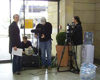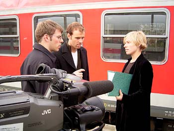 In Produktion: Was denkt man, wenn...? , ein Kurzfilm von Rasmus GreinerEs klingt ein bisschen nach Schutzgelderpressung: Wenn man im Kieler Hauptbahnhof einen Film drehen will, bekommt man zwei Wachmänner verordnet, die man selber bezahlen muss (25 Euro pro Nase und Stunde). Will man in einem fahrenden Waggon drehen, muss man ihn komplett mieten (Fahrkarten für 24 Plätze).Rasmus Greiner (22) aus Arkebek in Dithmarschen, der seine erste Filmerfahrung an der Gelehrtenschule in Meldorf sammelte und zur Zeit Medienwissenschaften in Marburg studiert, hat schnell begriffen, dass die Deutsche Bahn AG kein wirkliches Interesse daran hatte, sein Kurzfilmprojekt Was denkt man, wenn...? zu unterstützen. Doch zähes Feilschen erbrachte schließlich finanzierbare Rahmenbedingungen und die lang ersehnte Drehgenehmigung - genau einen Tag vor Produktionsbeginn. Auf einen Guerilla-Dreh ohne Erlaubnis hatte das Team keine Lust, schon weil die von der Kulturellen Filmförderung S.-H. bereitgestellte DV- und Tonausrüstung zu auffällig war. So ergaben sich nun eher Probleme damit, dass die Wachleute ihren Job zu gründlich machten und ihre maßregelnden Rufe beim Absperren des Drehorts mit auf die Tonspur gerieten. Weil das Team mit fünf Personen und zwei Darstellern überschaubar war und, abgesehen von ein paar Aufhellern, nur mit vorhandenem Licht gedreht wurde, war man flexibel und das Timing mit ein- und ausfahrenden Zügen klappte gut. Auch Regisseur Zufall kam gelegentlich zu Hilfe und verschaffte im rechten Moment eine ansehnliche Schar Reisegäste für den Bildhintergrund.![]() ![]() |