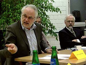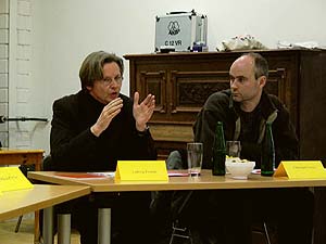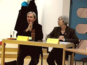 Grüner Roundtable zur Medienbildung und Medienausbildung in Schleswig-HolsteinDie Landtagsfraktion und die Landesarbeitsgemeinschaft Medien von Bündnis 90/Die Grünen veranstalteten am 3. Februar in der Kieler Pumpe ein Roundtable-Gespräch unter Medienfachleuten.Eine positive Bilanz der vielfältigen Aufbauarbeit der letzten Jahre zog Irene Fröhlich als medienpolitische Sprecherin von Bündnis 90/Die Grünen im Landtag. In der Rückschau sei deutlich geworden, wie sehr sich die Medienlandschaft in Schleswig-Holstein entwickelt habe, gerade auch im Bereich der Ausbildung, der den Grünen besonders wichtig ist.Irene Fröhlich nannte in diesem Zusammenhang die verstärkten Aktivitäten der Filmförderungen im Weiterbildungsbereich, die von den Grünen zusammen mit der SPD gesetzlich ermöglicht wurden, die Gründung einer Landesberufsschule für Mediengestalter Bild und Ton in Neumünster auf Initiative der regionalen Medienwirtschaft, die Einrichtung neuer Medienstudiengänge in Kiel, Lübeck und Flensburg, die Aufwertung und Neuausrichtung der Muthesius-Hochschule, grenzüberschreitende Pilotprojekte in der Zusammenarbeit mit Dänemark, wie FilmTrain, die achtbaren Festivalerfolge junger FilmemacherInnen aus dem Land und schließlich eine äußerst enge und aktive medienpädagogische Infrastruktur von den Offenen Kanälen bis zur LAG für Jugendfilmarbeit. Das Moderatoren-Team Kay Ilfrich und Irene FröhlichIn der Diskussion unter den Fachleuten wurde aber auch deutlich, dass weiterhin ein großer Bedarf an Koordinierung und Strukturierung in den betrachteten Handlungsfeldern, von der schulischen Medienbildung über die berufsorientierte Ausbildung, die Hochschulen, bis hin zur Weiterbildung besteht.Die VertreterInnen der Medienwirtschaft forderten, dass die Politik auch in konjunkturell schwierigen Zeiten weiterhin die Rahmenbedingungen aktiv gestalten und an dem Ziel der Qualitätssicherung auf allen Ebenen festhalten solle. Die Vertreter des NDR verwiesen auf die erfolgreichen Programme des Landesfunkhauses. Dem Anliegen, mit Produktionsmitteln des NDR regionale Strukturförderung zu betreiben, seien aber aus Gründen des Erhalts der journalistischen Qualität und Unabhängigkeit aus Sicht des NDR enge Grenzen gesetzt. Das gleiche gelte für die in Hamburg angesiedelten Ausbildungskapazitäten. Filmemacher und Medienpädagoge Ulrich Selle (rechts) beim Referat Ludwig Fromm, Rektor der Muthesius Kunsthochschule (links), und Christoph Corves, Leiter der Arbeitsgruppe Geographie und Medien am Institut für Geographie der CAU v.l.: Detlef Freiherr von der Goltz, Video Media Studios Kiel, Klaus Kirchwehm, Vico GmbH und Vorstand des Photo- und Medienforums Kiel (Fotofachschule), in der Mitte verdeckt: Corinna Knott, Geschäftsführerin des Photo- und Medienforums Kiel (Fotos: Lorenz Müller)Kay Ilfrich von der Landesarbeitsgemeinschaft Medien von Bündnis 90/Die Grünen fasste am Ende den vordringlich genannten Handlungsbedarf zusammen: