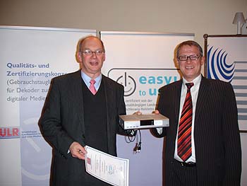 Die ULR hat am 15.12. in Kiel das erste Gütesiegel für „Gute Gebrauchstauglichkeit“ für TV-Digitaldekoder verliehen. Zertifiziert und mit dem Prädikat „easy to use!“ ausgezeichnet wurde der Satelliten-Digitaldekoder HUMAX F2-FOX des international tätigen Herstellers Humax Digital GmbH. Dieser Dekodertyp hatte in einer unabhängigen Prüfung durch die Forschungsgruppe Industrieanthropologie (FIA), Universität Kiel, alle 52 Prüfkriterien eines von der FIA im Auftrag der ULR entwickelten Qualitäts- und Zertifizierungskonzepts erfüllt und damit seine besondere Nutzerfreundlichkeit unter Beweis gestellt.