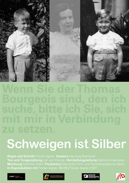 Dokumentarfilm „Schweigen ist Silber“ hat PremiereDer Dokumentarfilm „Schweigen ist Silber“ von Florian Aigner (gefördert u.a. von der Kulturellen Filmförderung S.-H.) hat in Berlin Premiere.Samstag, 24.2.2007, 13.30 Uhr im Kino Arsenal (Potsdamer Str. 2, Filmhaus unten, S- und U-Bhf. Potsdamer Platz).Nach der Premiere wird in der dffb, Filmhaus 9. Stock, angestoßen und heiß diskutiert. Denn: Reden ist Gold.![]() |