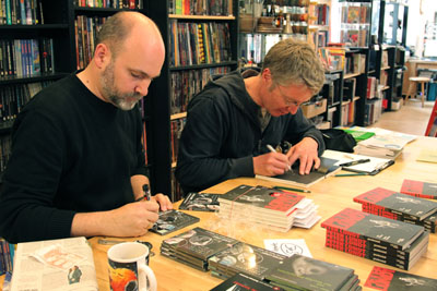 Hörspielreihe „Peter Lundt“ jetzt auch als ComicSchon seit einigen Jahren ist die Hörspielreihe „Peter Lundt“ des Neumünsteraner Drehbuch- und Hörspielautors Arne Sommer sehr beliebt. Jetzt hat sich Sommer mit dem Kieler Comiczeichner Volker Sponholz zusammengetan, um den blinden Detektiv auch im Comic ermitteln zu lassen: Arne Sommer (Text) / Volker Sponholz (Zeichnungen) Carlsen Verlag, 144 Seiten, € 9,95 ![]() Im Sommer 2007 lernten Sommer und Sponholz sich kennen und fanden die Idee reizvoll, den durch Hörspiele bekannten blinden Detektiv Peter Lundt im Comic umzusetzen. Die eine oder andere Woche ging ins Land, der Verlag wollte überzeugt werden, ein Szenario geschrieben und letztlich eben auch 140 Seiten gezeichnet werden. Das dauert, aber nun ist der erste Peter-Lundt-Comic fertig und seit dem 27. Mai 2011 im Handel. ![]() Autor Arne Sommer (l.) und Zeichner Volker Sponholz beim Signieren in der Kieler Comic-Buchhandlung Fantasyreich am 28. Mai 2011 (Foto: Lorenz Müller)Wer jetzt mehr wissen möchte, kann sich durch die Facebook-Seite der Autoren klicken – übrigens auch ohne sich da registrieren zu lassen. Seit Anfang Mai haben Sommer und Sponholz jeden Tag Notizen, Skizzen, Entwürfe, Fotos, Reinzeichnungen und Anekdoten dort gepostet, garniert von sonntäglichen Preisrätseln. Alles weitere unter: www.facebook.com/peter.lundt. Am 1. Juni 2011 ab 16 Uhr stellen die Autoren das Buch im Kaufhaus Holstenstraße in Neumünster vor. Am 9. Juni 2011, 19.30 Uhr findet dann die offizielle Book-Release-Party im „Terrace Hill“ in Hamburg (Feldstr. 66, 5. Stock) statt. Dort gibt’s die erste Peter-Lundt-Comic-Lesung mit den Hörspielsprechern und den Bildern des Comics – dessen Story ja völlig neu ist und als Hörspiel gar nicht existiert. (nach einer Produktionsnotiz von Volker Sponholz) |