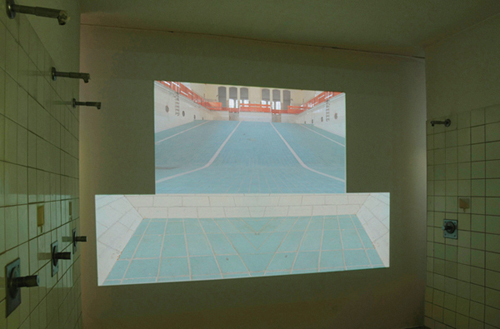 Crossing the line – Janne Höltermanns Videoinstallation „kacheln†im Lessingbad KielUnser Raumempfinden als Stadtmensch ist so rechtwinklig wie die Linien und Ecken der Architektur, in der wir leben. Unsere Bewegungen werden geregelt und begrenzt durch sichtbare Linien auf dem Boden und unsichtbare Linien in unseren Köpfen. Wir akzeptieren jedes Gartentürchen als Grenze zwischen Drinnen und Draußen, zwischen Dein und Mein. Wir schreiten über Zebrastreifen und treten in gelb markierte Felder, bevor wir eine Zigarette anzünden. Diese Linien, ob konkret oder imaginär, sind die Ariadnefäden, aus denen wir uns ein Sicherheitsnetz der Orientierung knüpfen. Wie fragil dieses Netz ist, hat Janne Höltermann bereits in ihrer Fotoserie „lots†(2009) klar gemacht, indem sie die perspektivisch verzerrten Markierungen auf Parkplätzen und Fußgängerwegen nachträglich begradigte und damit eine kubistisch verwirrende Gleichzeitigkeit von An- und Aufsichten erzeugte. Das strenge Raster der Fliesen im Lessingbad erinnert daher nicht zufällig an das Orientierung gebende Netz von Längen- und Breitengraden auf einer Weltkarte, deren Ozeanflächen sogar das gleiche Türkisblau zeigen wie die Bodenfliesen des Schwimmbeckens. Die rasenden Bilder, die wir sehen, sind aber kein „Point of viewâ€, keine subjektive Kamera, die eine menschliche Wahrnehmung simuliert wie bei Verfolgungsjagden im Hollywoodkino. Sie zeigen den maschinenhaften Blick eines Sensors, der emotionslos die Umgebung scannt und vertraute Zeichen und Orientierungspunkte zu grafischen Mustern reduziert, bis ins dekorativ Ornamenthafte. Die Kamera überquert dabei ungerührt die Markierungslinien, die einst den chlorgetrübten Augen der Schwimmer die Richtung weisen sollten, und im Zusammenspiel aus drei synchronisierten Bildkanälen entstehen Kaleidoskop-Effekte, die endgültig die Dimensionen des Raumes durcheinander wirbeln. Die gefällige Ästhetik, die diesen Bildern innewohnt, wird durch eine penetrante Tonspur gebrochen, die Hinweise auf den Schaffensprozess gibt. Das Rattern der Installation dringt lautstark durch die ganze „Damenseite†der Badeanstalt und verrät, dass die Kamera keineswegs schwebt oder schwimmt, sondern sehr bodenständig und erdverbunden mit einem Rollwagen über die Fliesen kachelt. ![]() „kacheln†in der Damendusche: Janne Höltermanns Beitrag zur Ausstellung „Körpersichten†im Kieler Lessingbad (Fotos: Janne Höltermann)Die Kamera ist die eigentliche Protagonistin in Janne Höltermanns durchweg menschenleeren Videos. Am Ende jeder Bahn schlägt das Gerät einen Purzelbaum und stellt die Welt auf den Kopf. Der Apparat wird selbst zum „spinning object†wie in ihrer gleichnamigen Serie von Kurz-Clips, in denen sich Kreisel, Flaschen und Münzen gegen die Regeln von Zeit und Raum auflehnen. Das Element der Drehung als Quelle schwindelerregender Verwirrung findet sich mehrfach in Janne Höltermanns Videoarbeiten. In „spin†(2010) wird eine gläserne Drehtür zum Rührwerk, das gemächlich den Innenraum nach draußen schaufelt und zurück. In „bulbs†(2007) kreist eine Glühbirne im Licht eines Beamers unablässig über einem Ventilator und wirft mehr Schattenbilder, als ihr zustehen. Auch in der Videoserie „gyms†(2008), an die die „kachelnâ€-Arbeit direkt anknüpft, rumpelt die Kamera über leere Aschenbahnen und Turnhallenböden bis zum finalen Überschlag. Mit solchen Bildern zieht Janne Höltermann uns den Boden unter den Füßen weg und zerreißt die Netze, die uns auffangen könnten. Wir sollten also besser nicht vom Beckenrand springen. (Lorenz Müller) Die genannten Arbeiten sind dokumentiert auf Janne Höltermann (geb.1977) studierte in Madrid und an der Muthesius Kunsthochschule in Kiel, erhielt 2005 den Muthesiuspreis der NordWestLotto GmbH und war Stipendiatin am Massachusetts College of Art and Design in Boston. Zur Zeit hat sie für zwei Jahre einen Lehrauftrag für digital arts an der Wesleyan University in Middletown, Connecticut. Mit Ihrer aktuellen Installation „kacheln†nahm sie an der Ausstellung „Körpersichten†der Muthesisus Kunsthochschule im Kieler Lessingbad teil (1. bis 24. Juni 2011). Die Arbeit entstand mit technischer Unterstützung der Filmwerkstatt Kiel der Filmförderung Hamburg Schleswig-Holstein. |