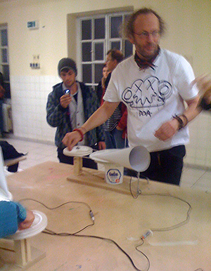 Der Raum hörbar, der Klang sichtbarDas Symposium „Augenhören | interArtiv | Ohrensehen“ entwarf ein umfassendes (Hör-) Bild aktueller KlangkunstWas ist Klangkunst? Eher eine bildende oder eine musikalische? Wie verbinden sich beide „interartiv“? Was wird aus Klang, wenn er in Relation zum Raum tritt – und umgekehrt? Einige der Fragen, denen das von der Muthesius Kunsthochschule und dem Neue-Musik-Projekt chiffren in Zusammenarbeit mit der Lübecker Musikhochschule und dem Institut für Neue Musik und Musikerziehung Darmstadt im Kieler Lessingbad veranstaltete Symposium „Augenhören | interArtiv | Ohrensehen“ nachging – in Vorträgen namhafter Klangkünstler, aber vor allem auch anhand praktischer Arbeiten gegenwärtiger Klangkunst. Wie ein physikalischer Versuchsaufbau, dessen Gegenstände zur Skulptur werden, mutet zunächst Alvin Luciers Installation „Music on a Long Thin Wire“ an, welchen langen Draht Hauke Harder längs über das Schwimmbecken des Lessingbads gespannt hat und der dem Symposium gleichsam den Grund- oder Orgelton gibt. Im Draht fließt Wechselstrom, der ihn vermöge eines Magneten nach dem Funktionsprinzip des Lautsprechers in Schwingungen versetzt. So einfach die elektromagnetische Anordnung ist, so komplex und „chaotisch“ sind ihre akustischen Wirkungen, denn der Draht reagiert empfindlich auf Änderungen der Umgebung, etwa Temperatur. „Auf ihm zu spielen erfordert Fingerspitzengefühl“, weiß Harder, der Luciers Klanginstallation seit 15 Jahren in ganz Europa mehrfach realisierte (zuerst 1995 in der Kieler Stadtgalerie). Mit ganz unterschiedlichen Klangergebnissen, denn die Schwingungen des Drahts „entfalten ein Eigenleben“, wechselwirken „individuell“ mit dem Raum, bilden ihn gleichsam akustisch ab. Jene Wechselwirkung, die Wahrnehmung und Erkenntnis auf ungewohnte Weise ermöglicht, scheint alle Klangkunst auszumachen und verbindet in ihr das musikalisch mit dem bildnerisch Komponierten. Der Raum wird hörbar, der Klang sicht- und tastbar. Überdies hinterfragt Klangkunst den künstlerischen Modus des Abbildens erkenntnistheoretisch, was Petra Maria Meyer in ihrem Vortrag mit dem programmatischen Titel „Hören gegen Sehgewohnheiten“ verdeutlicht – anhand früher Klangkunst wie Walter Ruttmanns Experimenten mit der Tonspur von Filmen in den 1930er Jahren sowie der Radiokunst, die sich film-rhythmischer (und damit ursprünglich am Bild orientierter) Montagetechniken bedienen. Neben ihrem skulpturalen hat Klangkunst oft auch einen performativen, den Zuhörer und Zuschauer unmittelbar einbeziehenden Aspekt. Das Staalplaat Soundsystem hat in „Musica povera al dente / fluxYOU“ 20 selbst gebastelte Grammophone aufgebaut, die von Hand und nach einer Partitur John Cages bedient das „Scratching“ der DJs vorwegnehmen, wobei während der Performance die Schallplatten wie die Schalltrichter aus Pappe mit allerlei Werkzeugen manipuliert und damit die Klänge neu formiert werden. ![]() Staalplaat Soundsystem im Lessingbad in Aktion (Foto: jm)Auf das Performative der Klangkunst nimmt auch Brandon LaBelle Bezug. Seine Arbeit „The Sound at the Back of the Mouth, almost“ kommt wie ein Vortrag daher, ist jedoch eine Performance über die Stille – und deren Lautheit, wie sie sich im Gewirr der „inneren Stimme(n)“ entwickelt. LaBelle spricht nicht, er projiziert reinen Text, der dennoch mit uns und unserer inneren Stimme, die wir hören, wenn wir lesen, in Dialog tritt. Und fragt, wer da so hörbar in und mit uns spricht, ohne dass man das hörte. Kunst, die den Klang in den imaginierten Innenraum verlegt, dorthin, wo er womöglich ohnehin nur erklingt und sich verbildert (Pencast by jm – auf den Text klicken und hören, was zu hören war, während er geschrieben wurde ...). Wie auch die leisen „Tropfen“, die Muthesius-Absolvent Heiko Wolmersdorf im Treppenhaus erklingen lässt und damit dem ehemaligen „Wasserort“ Lessingbad klanginneren wie raumäußeren Tribut zollt. Ähnliche Ver- und Erinnerungen von Klang aus dem öffentlichen in den inneren Raum untersuchte auch die Klangkunst-Pionierin Christina Kubisch in ihren „Electrical Walks“. Die Klangspuren von Großstädten sammelte sie in komponierten Stadtrundgängen, wo der inzwischen alltäglich gewordene elektromagnetische „Smog“ zu Klang im per Induktion empfangenden Kopfhörer wird. Auch hier die instruktive Forschung, wie der Klang sicht- und damit der Raum hörbar wird. (jm) |
