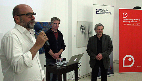 Arne Sommer (l.), Leiter der Filmwerkstatt Kiel der FFHSH, begrüßt das Publikum in der schleswig-holsteinischen Landesbibliothek und stellt die Vortragsgäste zum Thema „Storyboard” vor: Jens Jeddeloh (r.) und Volker Sponholz (m.) (Foto: Lorenz Müller)