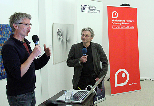 Volker Sponholz (Comic-Zeichner (u.a. „Bertis Buben“), Comic Center Kiel, Mitherausgeber der Comic-Zeitschrift „Pure Fruit“) und der Berliner Comic-Zeichner und in mehreren Produktionen erfahrene Storyboard-Artist Jens Jeddeloh zeigten in einem instruktiven Vortrag, wie Story-Boarding dem Film einen echten Comic-Kick geben kann. Storyboards, die skizzenhafte Vorzeichnung von Filmbildern und -sequenzen, führte einst Walt Disney für seine Trickfilme ein – um Kosten zu sparen: Ganze Filme wurden zunächst in repräsentativen Einzelbildern skizziert auf den Soundtrack gelegt, um hinterher nur die Szenen wirklich zu animieren, die auch gebraucht wurden. Story-Boarding für Real-Filme ist zwar zunächst ein zusätzlicher Kostenfaktor in der Projektentwicklung, indem es aber das Drehbuch vorab detailliert visualisiert – in enger Zusammenarbeit des Zeichners mit Regisseur und meist auch Kameramann – kann es die Produktionskosten am Set erheblich reduzieren.
