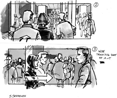 Jens Jeddeloh berichtete von seinen Erfahrungen bei Produktionen wie der Comic-Verfilmung „Aeon Flux“ (USA/D 2005, Regie: Karyn Kusama). Dort war zwar schon viel vorgegeben, seine szenischen Zeichnungen zur „Visualisierung in der Vorstufe“ etwa einer Verfolgungsszene in einer U-Bahn anhand eines Set-Modells wurden dennoch fast 1 zu 1 umgesetzt. Mit diesem Beispiel und dem einer Probearbeit zu einer Revisualisierung einer Szene aus „Batman“ erläuterte Jeddeloh auch die eigene Zeichensprache eines Storyboards (Pfeildiagramme für Bewegungen der Kamera und Darsteller sowie Zooms).