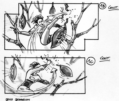Ausschnitt des Storyboards von „Aeon Flux”, für das der Storyboard-Artist Jens Jeddeloh ein plastisches Architekturmodell zur Verfügung hatte, um die Bewegung von Kamera und Protagonisten zu visualisieren (Foto: Jens Jeddeloh)