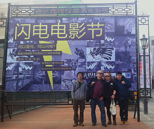 BLITZFILM zurück in China2006 ging es auf Einladung eines chinesischen Kurators erstmals nach Sezuan. Daraus entwickelte sich das BLITZFILM Festival. Die reisende Präsentation deutscher Kurzfilme in China ist längst zu einer Institution geworden. Das Interesse ist enorm und 2014 musste einigen Auftrittsorten eine Absage werden. Der prall gefüllte Tourplan dieses Jahres enthält neben den Filmprogrammen, auch Workshops und Vorträge. Wollte man allen Anfragen nachkommen, würde eine mehrmonatige Tour herauskommen. Der Hunger nache dem bewegten Bild aus Deutschland ist beeindruckend. Man findet ihn an den Hochschulen, im Kunstbetrieb und an alternativen Veranstaltungsorten. ![]() Die BLITZFILM-Crew vor Festivalplakat (Foto: Karsten Weber)Ein ausführlicher Bericht über die diesjährige BLITZFILM-Tour durch China folgt in einer der nächsten Ausgaben von infomedia-sh.de. (nach einer Produktionsnotiz des BLITZFILM Festivals) |