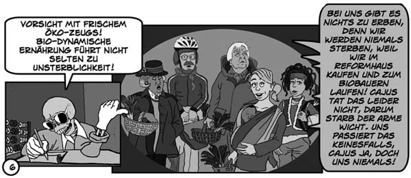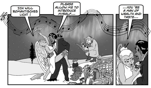 „Die Ewigkeit und das Lebenâ€Comic von Mins Minssen und Lorenz Müller ist jetzt onlineEine archaische Märchengeschichte um einen müden, alten Friedhofswärter, der sich allmählich Sorgen macht, dass er unsterblich sein könnte. Um dem Lauf des Schicksals nachzuhelfen, sucht er Hilfe bei Gevatter Tod und bucht eine All-Inclusive-Reise ins Jenseits. Doch wie so oft bei Billig-Reisen gibt es ein paar Haken, und das zuständige Personal beschäftigt sich lieber mit seinen eigenen Problemen … Die vom Kieler Autor Mins Minssen erdachte Geschichte sollte ursprünglich als Kurzfilm mit realen Darstellern realisiert werden. Nach einer Entwicklungsphase, in der stattdessen ein Stop-Motion-Animationsfilm angedacht war, entstand, angeregt durch die Entwurfszeichnungen, gemeinsam mit Lorenz Müller die Idee, das Projekt lieber als Comic umzusetzen. (Übrigens: Auch wenn die Geschichte zum größten Teil in Eis und Schnee spielt, werden ortskundige Leser ein paar Details vom Kieler Südfriedhof wieder erkennen.) ![]() Lorenz Müller und Mins Minssen kannten sich seit der Postproduktion von Minssens surrealem Kurzfilm „Keine Paternoster auf den Lofoten†von 2005. 2012 und 2013 erschien die Printfassung des Comics als Fortsetzungsgeschichte in der damaligen Kieler Stadtteilzeitschrift „Unser Blücher†unter dem Titel „Das ewige Lebenâ€. ![]() Um Verwechslungen und urheberrechtliches Durcheinander mit dem gleichnamigen Roman von Wolf Haas und der Verfilmung durch Wolfgang Murnberger zu vermeiden, erhielt das Werk dann den neuen Titel „Die Ewigkeit und das Leben†und ist nun auf einer eigenen Website gratis abrufbar: www.ewigkeit-und-leben.de . (nach einer Mitteilung der Autoren) |