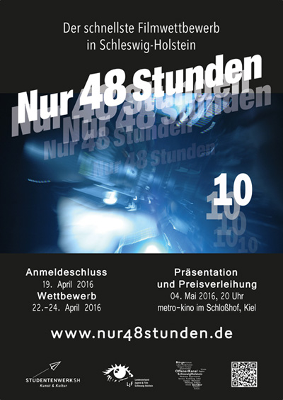 Zum 10. Mal: Filmwettbewerb „Nur 48 Stunden“Unser Filmwettbewerb „Nur 48 Stunden“ feiert in diesem Jahr ein kleines Jubiläum. Zum 10. Mal führen das Kulturbüro des Studentenwerks Schleswig-Holstein, der Landesverband Jugend & Film Schleswig-Holstein und der Offene Kanal diesen Wettbewerb durch. Darauf sind wir Veranstalter auch ein bisschen stolz. Dass sich „Nur 48 Stunden“ so erfolgreich etabliert hat, verdanken wir vor allem euch, die ihr jedes Jahr Filme unter den besonderen Umständen dreht und uns immer wieder mit tollen und verblüffenden Ergebnissen erfreut. Herzlichen Dank dafür. Hier nun die Termine für den Jubiläumswettbewerb: Anmeldeschluss: 19. April 2016 Drehwochenende: 22. – 24. April 2016 Präsentation und Preisverleihung im metro-Kino im Schloßhof: 4. Mai 2016 Anmeldung zum Wettbewerb ab sofort an: Kultur@Studentenwerk.sh (Name u. Wohnort/Abgabeort) Infos: www.nur48stunden.de ![]() Filmteams aus Schleswig-Holstein sind aufgerufen, in nur 48 Stunden ihren Wettbewerbsfilm zu produzieren. Wie immer gibt es ein Thema sowie drei Elemente, die im Film auftauchen müssen, als Vorgabe. Die besten Filme werden im Kieler metro-Kino im Schloßhof gezeigt, und ihr könnt Preise im Gesamtwert von 750 Euro gewinnen, darunter den mit 350 Euro dotierten „Jürgen-Prediger-Filmpreis“, einen zweiten und dritten Preis sowie den Publikumspreis. Auch ein Nachwuchspreis wird vergeben. Die angestrebte Zusammenarbeit mit den anderen Bundesländern konnte leider noch nicht realisiert werden. Stattdessen werden wir in diesem Jahr einen Filmabend mit den Preisträgern (1. und Publikumspreis) der zehn Wettbewerbsjahre veranstalten. (nach einer Mitteilung des Kulturbüros des Studentenwerks Schleswig-Holstein) |