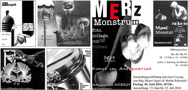 Die Monstren sind unter unsAusstellung im Antiquariat DIDEROT: „MERz.Monstrum“, Foto-Collage-Cutup-Roman von ögyrDas Kieler Antiquariat DIDEROT (Inh. Jasmin Fritz) zeigt vom 10. Juni bis 31. August 2016 die Original-Collagen aus dem Foto-Collage-Cutup-Roman „MERz.Monstrum“ des Kieler Autors ögyr. Zur Vernissage am Freitag, 10. Juni 2016, 18 Uhr, stellt ögyr das in den Wendezeiten 1990 begonnene und bis heute immer wieder in verschiedenen Medien überarbeitete Werk vor und liest zusammen mit dem Kieler Autor Stefan Schwarck Texte daraus. „MERz.Monstrum“ entstand in der (bewusst epigonalen) Tradition von DADA, Kurt Schwitters und John Heartfield zwischen 1990 und 1993 – zunächst als noch „klassisch“ mit Schere und Klebstoff aus Fotomaterial von Illustrierten und Zeitungen montierte „Comic-Collage“. Parallel beziehungsweise als Vorläufer entstanden Cutup-Texte, die in die Collage eingearbeitet wurden. 1999 – noch in den Frühzeiten des Internet – entwickelte ögyr aus diesem hier erstmals als Original-Collagen ausgestellten „Comic“ einen vielfach zwischen Bild-, Video- und Text-Collage verlinkten Hypertext auf seiner Website schwungkunst.de. Mit diesem „cut.up.pic/dia.rrhoe.dub“ „MERz.Monstrum 2.1“ (www.schwungkunst.de/merz21) gewann ögyr im Dezember 2001 den mit 4000 DM dotierten 1. Preis des vom damaligen kulturnetz-sh.de ausgeschriebenen Wettbewerbs für künstlerische Multimedia-Projekte. ![]() Flyer-Motiv, Collage der Collage (Foto: ögyr)ögyr über Inhalt und Entstehung von „MERz.Monstrum“ In Wendezeiten, an persönlichen oder historischen Nahtstellen, stellen sich die Grundfragen des Seins und damit auch der Kunst vehement und unausweichlich. So auch mir, einem in den frühen 80ern kleinbildungsbürgerlich „links“ Sozialisierten aus dem geburtenstärksten Jahrgang 1964, mit verwandschaftlichen Wurzeln in der Ex-DDR und daher, (wie ich damals offensiv und provo-punkig behauptete) „meinem Vaterland“. Die alte, meine Jugend begleitende, relativ stabil erscheinende Ordnung des Kalten Krieges und zweier konkurrierender, aber ebenbürtiger Gesellschaftsentwürfe kollabierte am 9. November 1989 (ausgerechnet wieder der 9. November). Nach (zu langem) Physikstudium begann ich da gerade meine Diplomarbeit, verwirrt und zugleich „geteast“ von beidem (ich war in meiner Biografie an der Wende von der Naturwissenschaft zu Philologie, -sophie und Kunst). Wie auch von Wendezeiten vorher: 1916, vor 100 Jahren, als in Zürich DADA die Kunst revolutionierte, weil die Welt aus den Fugen war. Und nachher, als am 11.9.2001 (immer wieder die teuflische 9 und das Werthersche „nach Eilfe“ im Datum ...) die sich turbokapitalistisch, imperialistisch globalisierende Welt von zu blindem Terror Verzweifelten aus den Angeln gehoben wurde. Nahtstellen, an denen sich die uralten Fragen nach Gut vs. Böse stellen – nicht nur dem Künstler. Wenn Gesellschaften sich neu formieren, geht es immer auch um (alte und neue) Schuld, deren Verantwortung und Verarbeitung: 1918, 1945, 1977 („Deutscher Herbst“), 1989, 2001 – 2016? 1987, beim Geiseldrama von Gladbeck, verloren die so genannten Medien, für die ich damals gerade begonnen hatte zu arbeiten, ihre Unschuld. Die „Sensation“ von „Monstern“ wurde mir bewusst – und vielleicht schon da entstand der Plan für „MERz.Monstrum“. Als der „Rosa Riese“ in den Wendejahren als „Die Bestie von Beelitz“ durch die nicht blühenden, sondern menschlich verdorrenden Landschaften seine frauenmordende Spur zog, hatte ich den Stoff für meinen Comic-Roman: Wolfgang Schmidt heißt in „MERz.Monstrum“ Volker Merz. Denn wir brauchen die Monstren, um uns vor dem eigenen Bösen in weichen Fernseh- oder Zeitungslesersesseln zu gruseln. Sie nehmen von uns die Schuld, indem wir sie zur Projektionsfläche unserer unbewussten Schuld machen – den Sündenbock zum Gärtner unserer Seelenkleingärten, abgegrenzt vom vorstädtischen, längst nicht mehr sicheren Jägerzaun. Das von mir angezettelte und ge-cut-upte „Merz.Monstrum“ begleitet mich also seit über 25 Jahren durch mein Schaffen. Es kündet in all seiner und meiner eigenen Verworfen- und Verworrenheit von der verzweifelten Sehnsucht nach etwas Gutem im Menschen – nach Liebe, nach persönlicher und Welt-Revolution, sei es auch nur in der Kunst. Ab- oder Vorgesang einer Utopie? Ausstellung: 10.6. bis 31.8.2016 im Antiquariat DIDEROT (Gutenbergstr. 5, 24116 Kiel). Vernissage: Fr, 10.6.2016, 18 Uhr – mit einer Lesung von ögyr und Stefan Schwarck. Öffnungszeiten: Mo, Di, Mi, Fr: 10-13 und 14-18 Uhr; jeden 1. Samstag im Monat: 10-14 Uhr; sowie nach telefonischer Vereinbarung. Die Original-Collagen stehen auch zum Verkauf. Web-Links: (nach einer Produktionsnotiz des Autors) |