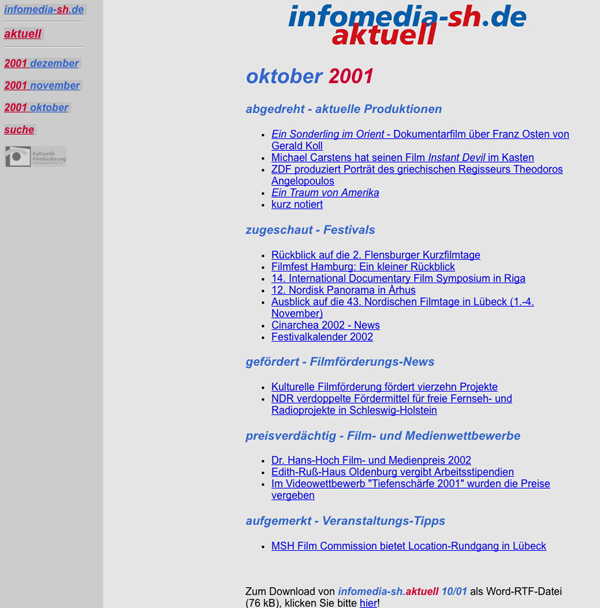 ![]() Der Newsletter zum Thema Medien in Schleswig-Holstein herausgegeben von Filmkultur Schleswig-Holstein e.V. |