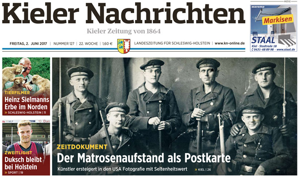 Stolze RevolutionäreDer Kiel-Berliner Filmemacher Kai Zimmer entdeckte eines der wenigen authentischen Fotos vom MatrosenaufstandIn Sachen Kieler Matrosenaufstand 1918 ist der Kiel-Berliner Filmemacher und Brockmann-Preisträger Kai Zimmer spätestens seit der Recherche zu seinem Film „Revolution 18“ (2012) ein Experte. Nun hat er im Internet eines der wenigen authentischen Fotos von Kieler revolutionären Matrosen entdeckt. ![]() Historisches Foto: Sechs Kieler Matrosen lassen die Freiheit hochleben. (Repro: Kai Zimmer)Der Beginn der Revolution, die am Ende des 1. Weltkriegs mit dem Matrosenaufstand Anfang November 1918 in Kiel ihren Ausgang nahm, ließ ihn nicht los, seit er in seinem Film das Tagebuch des Kieler Ingenieurs Nicolaus Andersen als Quelle benutzt hatte. Schon da war ihm aufgefallen, dass viele der in Geschichtsbüchern kolportierten Fotos vom Matrosenaufstand nicht aus Kiel stammten, sondern entweder aus Wilhelmshaven, wo die Matrosen den Befehl zum Auslaufen der kaiserlichen Flotte in den finalen Untergang verweigerten („Feuer aus den Kesseln!“), bevor solcher Funke in Kiel zum Aufstand wurde, oder aus Berlin, wohin sie von Kiel aus reisten, um die dortige Revolution zu unterstützen. In revolutionären Situationen zückt man eher die Waffe, als die Kamera. Aber Zimmer mochte nicht glauben, dass „da niemand Fotos gemacht hat“. Im Internet begab er sich in Sammler-Portalen auf die Suche und war enerviert, als er das Postkartenfoto von sechs revolutionären Matrosen entdeckte. Für knapp 100 Dollar ersteigerte er das „very rare image“ von einer Frau aus Oregon, USA, die es aus dem Nachlass ihres verstorbenen Bruders auf eBay anbot. Woher der das Foto hatte, lässt sich nicht mehr ermitteln. Zimmers Recherche ergab aber, dass das Foto offenbar in den bewegten Tagen zwischen 3. und 5. November 1918 aufgenommen wurde – im Studio des Kieler Fotografen Anton Busch (seinerzeit Holtenauer Straße 111), wie ein Stempel auf der Rückseite vermerkt. Stadtarchivar Johannes Rosenplänter konnte bestätigen, dass ein solcher Fotograf 1918 in Kiel arbeitete. An dem Foto fasziniert Zimmer vor allem „der Stolz der Revolutionäre, die offenbar genau wussten, dass sie Geschichte schrieben“. „Hoch lebe die Freiheit – 5. Nov. 1918“ haben sie auf eine Tafel an ihren Füßen geschrieben, eine wichtige Botschaft, weil der Fotograf sie zur Kenntlichkeit retuschierte. Zudem enthüllt eine genaue Betrachtung des Fotos, dass sich die Matrosen die kaiserlichen Kokarden von den Mützen gerissen haben und statt deutschen französische Karabiner tragen. Solches „revolutionäre Selbstbewusstsein“ sieht auch Stadtarchivar Rosenplänter in dem „sehr wichtigen Dokument“, das Zimmer in eine Neufassung seines Films „Revolution 18“ einarbeiten will. Aber womöglich gibt es ja noch mehr bislang verschollenes Fotomaterial zum Matrosenaufstand, das die geplanten Feierlichkeiten zum 100. Jahrestag des Matrosenaufstands bebildern könnte. Wer derlei findet, möge sich mit dem Stadtarchiv in Verbindung setzen unter E-Mail stadtarchiv@kiel.de oder Tel. 0431-901-3422. „Und vielleicht entdeckt auf ’meinem’ Foto ja noch jemand seinen (Ur-) Großvater“, hofft Zimmer. ![]() Titel der KN vom 2.6.2017Anmerkung am Rande: Das Foto der sechs stolzen Revolutionäre von 1918 zierte die Titelseite der „Kieler Nachrichten“ vom 2. Juni 2017, am 50. Jahrestag eines anderen Revolutionsbeginns, dem Todestag von Benno Ohnesorg ... Kai Zimmer: „Best Titelbild ever!“ (jm) |
