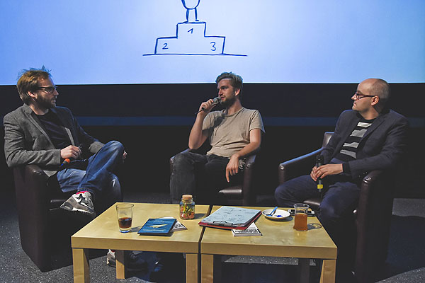 11. Filmfest Wismar – ein RückblickIn diesem Jahr zeigte der Sommer sich zum Filmfest nicht nur launisch, sondern er bescherte uns Dauerregen an allen drei Festtagen. Trotz Kälte und Nässe waren alle Vorstellungen gut besucht und unsere großen und kleinen Kinobesucher sowie die zahlreichen Gäste aus Film, Politik und Kultur erlebten ein fröhliches und spannendes Filmfest mit vielen berührenden Momenten und intensiven Gesprächen. Auch alle weiteren Angebote, ob aktive Medienarbeit, das traditionelle Branchentreffen, der Drehbuch-Vortrag oder das historische Filmfenster wurden mit großer Freude und Begeisterung angenommen. „Die Stadt ist stolz auf das Filmfest Wismar. Vor 11 Jahren begann nicht nur die Erfolgsgeschichte dieses Festivals, sondern auch die des Filmbüros mit seiner ganzjährigen Präsenz, seinen wichtigen Angeboten für Kinder, Erwachsene und Senioren. Mich erfreut die besondere Haltung die hier zu spüren ist, das ist ein wichtiger Ort für das Thema Film und Medien geworden. Das Engagement dieses Teams ist spürbar, auch weit über die Hansestadt hinaus. Für die konsequente Weiterentwicklung bedanke ich mich ausdrücklich bei Sabine Matthiesen und ihrem Team. Es war eine gute Entscheidung, großes Vertrauen in die Arbeit des Filmvereins zu setzen“, sagte Bürgermeister Thomas Beyer zur Eröffnung. Die vier Musiker von FABULA LUNA verzauberten zu Beginn das Publikum, und Jens Becker, der Regisseur von JAHRESRINGE (gefördert Filmförderung MV) wünschte den Besuchern per Videobotschaft aus Georgien eine schöne Premiere seines neuen Films, dem Portrait über Siegfried Wanka, den 88-jährigen charmanten Tausendsassa, der aus Berlin mit der Produzentin Tanja Georgieva angereist war. Im Anschluss überzeugte Regisseur Maix Mayer mit seinem Dokumentarfilm-Essay NOTATIONEN ZU ULRICH MÜTHER (gefördert Filmförderung MV), das Publikum ließ sich von seinem besonderen Blick auf den Meister der eleganten Schalenbauten, wie den Warnemünder Teepott, begeistern und es wurde intensiv und lange nach der Vorführung diskutiert. Der Produzent des Films, Olaf Jacobs, war leider im Unwetter stecken geblieben und verbrachte den Abend statt im Kino in Wismar auf der Autobahn. Maix Mayer schnitt mit großem Vergnügen die Filmfesttorte an, eine köstliche und meisterliche Nachbildung des Mütherschen Ahornblattes in Berlin, einer Hyparschale, von Konditor Senf aus Wismar. Jede Schale war mit einer anderen Sorte Buttercreme gefüllt. „Eine tolle Idee, die Überraschung ist gelungen“, freute sich Maix Mayer. Vertreter aus dem Müther-Archiv, das an der Hochschule Wismar betreut wird, hatten schriftliche Informationen rund um Ulrich Müther mitgebracht und berichteten den neugierigen Gästen über das seit April laufende Forschungsprojekt an der Hochschule. Der Samstag begann traditionell mit dem Filmemacherfrühstück und dem Netzwerktreffen der Vertreter der Medienbildung in Mecklenburg-Vorpommern. Ein gelungener und intensiver Austausch auf und vor der Leinwand! Christoph Woest, Absolvent der Hochschule Wismar und heutiger Mitarbeiter des NDR in Schwerin, stellte TYPO-Filme vor, die Spezialität des Studiengangs Kommunikationsdesign an der Hochschule Wismar. Weiter ging es mit dem praxisnahen und lebendigen Drehbuch-Vortrag „Wie bekomme ich mein Drehbuch in den Griff?“. Anhand des Kurzfilms FERTIG von Marcus Wojatschke, der im Vorjahr im Filmbüro seine Ausbildung als Mediengestalter Bild und Ton beendete und vor genau einem Jahr auch die Filmpremiere von FERTIG an gleicher Stelle gefeiert hatte, legten die beiden Dozenten Christian Mertens und Bartosz Werner die Finger in die Wunden und Fallen, die man beim Schreiben des Drehbuches vermeiden sollte. Sie ermutigten die anwesenden Zuhörer, die unterschiedlichen Fassungen eines Drehbuches in der Praxis auszuprobieren und Szenen vorab, z. B. mit einem Handy, zu drehen. Praxiserfahrung und Ausprobieren sei sehr wichtig! Leider mußte der Drehbuch-Vortrag, der eher ein kleines Seminar war, nach drei Stunden im Saal beendet werden, da die Vorstellung von FÜNF STERNE auf dem Programm stand. Der intensive Austausch wurde jedoch außerhalb des Saals im Bistro fortgeführt. ![]() Christian Mertens (links) und Bartosz Werner (rechts) im Gespräch mit Marcus Wojatschke über seinen Kurzfilm „Fertig“ (Foto: Michael Grabe, Filmbüro MV)FÜNF STERNE (gefördert Filmförderung MV) von Annekatrin Hendel bewegte die Zuschauer sehr, das intime Portrait ihrer Freundin Ines Rastig entstand im Januar 2016 in einem Hotelzimmer im „The Grand“ in Ahrenshoop, zwei Monate nach der Diagnose Lungenkrebs, vier Monate vor Ines‘ Tod. Er zeigt eine Freundschaft zwischen zwei Frauen und eine Lebensbilanz zwischen Krankheit und Facebook, zwischen Scheidung und Online-Liebe. Trotz der schweren Thematik war die Vorstellung gut besucht, und die Anwesenden haben ihren Mut nicht bereut. Jeder erlebte den Film auf seine Weise, denn was so persönlich verhandelt scheint, ist doch universell. Ob es das Sterben ist, aber auch Freundschaft, Suche nach Glück, Erfüllung und Liebe, überhaupt die Suche nach dem, was für einen richtig ist. Große Momente im Kinosaal. Auch DEPORTATION CLASS (gefördert Filmförderung MV) hinterließ Spuren, die teils dramatischen Bilder berührten tief und machten viele Besucher traurig. Der Dokumentarfilm zeichnet erstmals ein umfassendes Bild von einer Sammelabschiebung in Deutschland, genauer gesagt, in Mecklenburg-Vorpommern – Bilder, die so nie zuvor gedreht werden durften. Noch lange diskutierten die Zuschauer nach dem Film über dieses hochaktuelle Thema. Die Zuschauer waren sich einig: Ein wichtiger Film, den viele Menschen sehen sollten. Zum ersten Mal auf der Leinwand: Der Dokumentarfilm USEDOM – ODER DER FREIE BLICK AUFS MEER (gefördert Filmförderung MV) von Altmeister Heinz Brinkmann feierte seine Uraufführung in Wismar. Obwohl dies noch nicht die finale Fassung war und einige letzte Korrekturen vorg