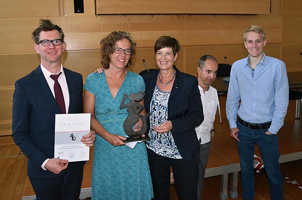 Stolz wie Oscar – Flensburger Kurzfilmtage mit der „Emmi för Plattdütsch“ ausgezeichnetOscar für die Hochschule: Mit ihrem „Plattdeutschen Trailerwettbewerb“ sind am 15. Juni 2017 die Hochschule Flensburg und die Flensburger Kurzfilmtage mit der „Emmi för Plattdüütsch in Sleswig-Holsteen“ ausgezeichnet worden. Die plattdeutsche Sprache lebt. Auch bei jungen Menschen. Sie löst sogar eine gewisse Faszination aus. Das beweisen nicht zuletzt Animationsfilme wie „Dr. Plattdüütsch“ und „Wuddeln“ von Flensburger Studierenden. Es sind die Siegerfilme der Plattdeutschen Trailerwettbewerbe 2013 und 2016. Und sie überzeugten auch die Jury für die „Emmi för Plattdüütsch in Sleswig-Holsteen“. Mit dem Preis – einer Meerjungfrau aus Eisen – zeichnen der Schleswig-Holsteinische Landtag, das Ministerium für Schule und Berufsbildung sowie der Schleswig-Holsteinische Heimatbund zum nunmehr fünften Mal besondere Bemühungen zur Förderung des Plattdeutschen in verschiedenen Bildungs- und Freizeiteinrichtungen des Landes aus. Werbung für das Plattdeutsche machen – das war auch die Intention, mit der der Förderverein des Zentrums für Niederdeutsch in Leck an Maja Petersen herangetreten war. „Sie wollten Filme produzieren, die auf humorvolle Weise die Lebendigkeit der plattdeutschen Sprache widerspiegeln, und wir kamen auf die Idee einen Wettbewerb für plattdeutsche Werbetrailer auszuschreiben“, erinnert sich Petersen. Die Projektleiterin der Flensburger Kurzfilmtage an der Hochschule Flensburg sprach mit Jim Lacy. Der Professor im Bereich Film und Animation bat seine Studierenden, entsprechende Werbespots zu machen. Eine Jury wählte zehn Kurzfilme aus, die Eingang ins Programm des Kurzfilmfestivals Flensburger Kurzfilmtage 2013 nahmen und ausgezeichnet wurden; dank des Sponsorings des Fördervereins des Zentrums für Niederdeutsch. 2016 fand der Wettbewerb erneut statt. „Der Trailerwettbewerb fördert das Plattdeutsche gleich auf mehreren Ebenen“, sagt Maja Petersen. Studentinnen und Studenten, die wenig oder überhaupt keinen Bezug zum Plattdeutschen haben, bekämen einen Zugang zur Sprache. Und die Verbreitung der humorvollen Filme über die sozialen Medien fördere ein jugendliches Image der Sprache. Das überzeugte auch die Jury. „Die Trailer laufen inzwischen auch im Kurzfilmprogramm für Schulklassen der ’Rolle Vorwärts’ und finden so Eingang in die Schulen“, ergänzt Thomas Dethleffsen, Vorsitzender der Flensburger Kurzfilmtage. Der nächste „Plattdeutsche Trailerwettbewerb“ soll 2018 stattfinden. Ein Link zu den Gewinnerfilmen von 2013 und 2016 über www.flensburger-kurzfilmtage.de. ![]() So sehen Sieger und Siegerinnen aus: Eine Delegation der Flensburger Kurzfilmtage bei der Preisverleihung: Jim Lacy, Maja Petersen, Thomas Dethleffsen und Jannik Menzel mit Susanne Bieler-Seelhoff (Mitte) vom Kulturministerium. (Foto: Yvonne Windel/Landtag SH)Die „Emmi för Plattdüütsch in Sleswig-Holsteen“ ist eine Auszeichnung für die Förderung des Plattdeutschen in verschiedenen Bildungs- und Freizeiteinrichtungen des Landes. Der Präsident des Schleswig-Holsteinischen Landtages verleiht die „Emmi" alle zwei Jahre gemeinsam mit dem Ministerium für Schule und Berufsbildung des Landes Schleswig-Holstein und dem Präsidenten des Schleswig-Holsteinischen Heimatbundes e.V. Wer als Preisträger die Emmi-Skulptur sowie eine Urkunde mit nach Hause nehmen darf, entscheidet eine Jury aus Mitgliedern der AG Bildung des Beirates Niederdeutsch. 2011 wurde der Preis als Nachfolge-Auszeichnung für das Plattdeutsche Schul-Siegel und für „Do mol wat op Platt" ins Leben gerufen und erstmalig verliehen. (nach einer Pressemitteilung der Hochschule Flensburg) |